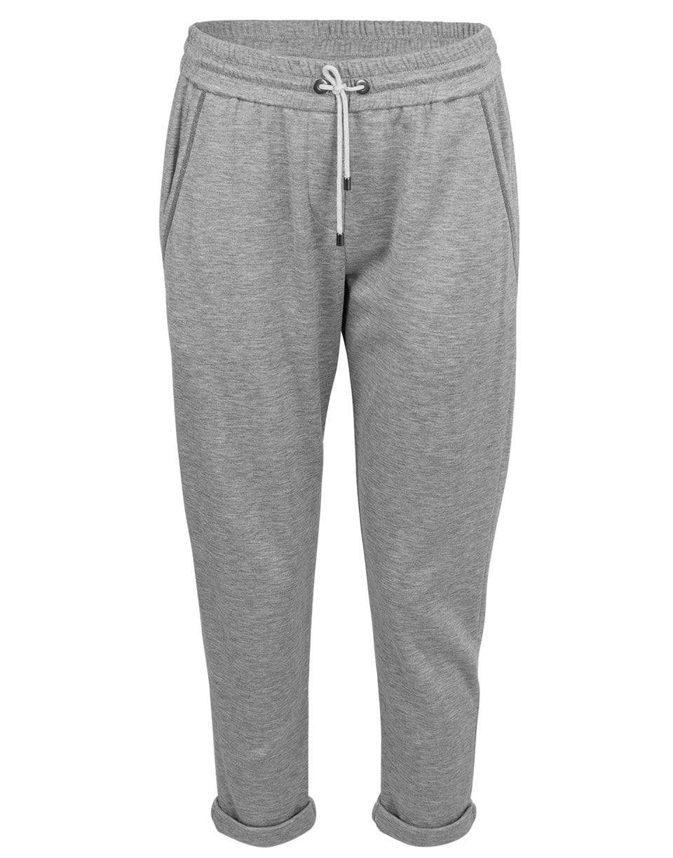 Pull on silk-cotton blend pants from Brunello Cucinelli featuring a mid-rise waist, drawstring closure, cuffed hems, relaxed fit, and side slash pockets finished with monili bead detail.