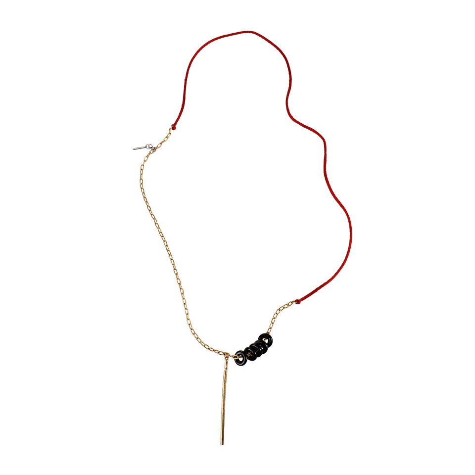 Boaz Kashi’s “pure 24” mixed-media necklace is a pure joy to wear. The punch of color its red silk cord lends to an everyday look is quite vibrant and unique, while the black onyx rings around the gold link chain provide a hint of edge.