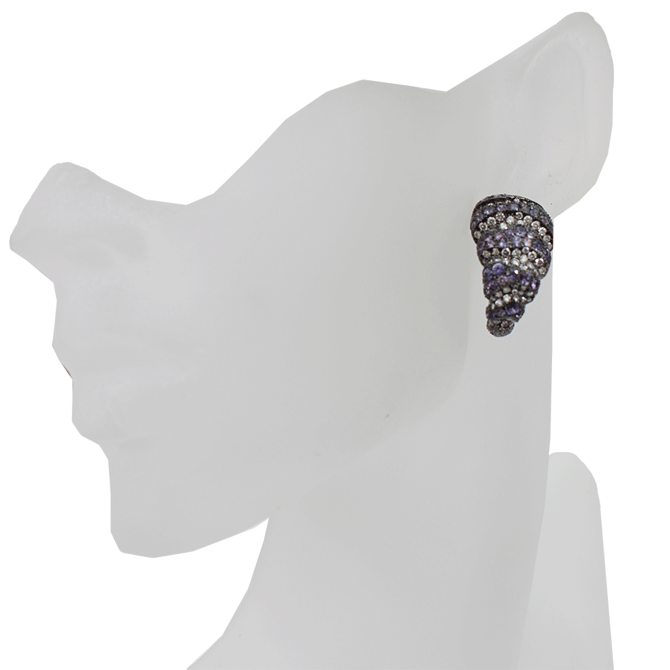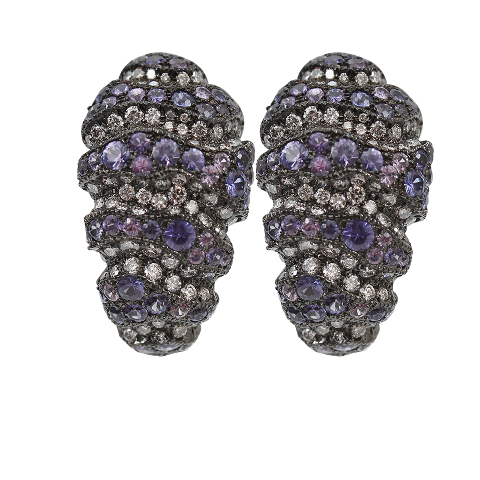Completely encrusted in stunning sparkle, Arunashi’s purple sapphire earrings with diamonds will bring any ensemble to life in an instant. Post Earrings 1” x 0.75” x 0.25” Purple Sapphires (7.940 CTW), Diamonds (4.37 CTW) Available in 18K Black Gold