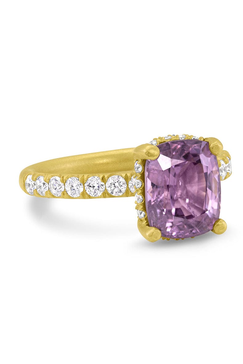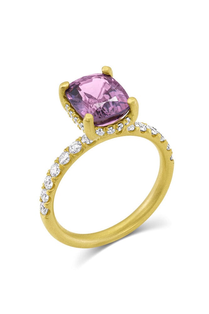 Leigh Maxwell purple spinel and diamond ring. Once mistaken for rubies, spinel are now appreciated in their own right. They are prized for their lush color palette of reds, oranges, blues and purples. This luscious 3.81ct cushion cut spinel is of a deep lavender hue. In 18K yellow gold and accented with 0.63ctw of diamonds this ring makes a striking statement.