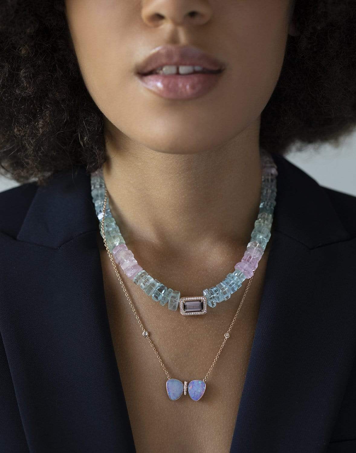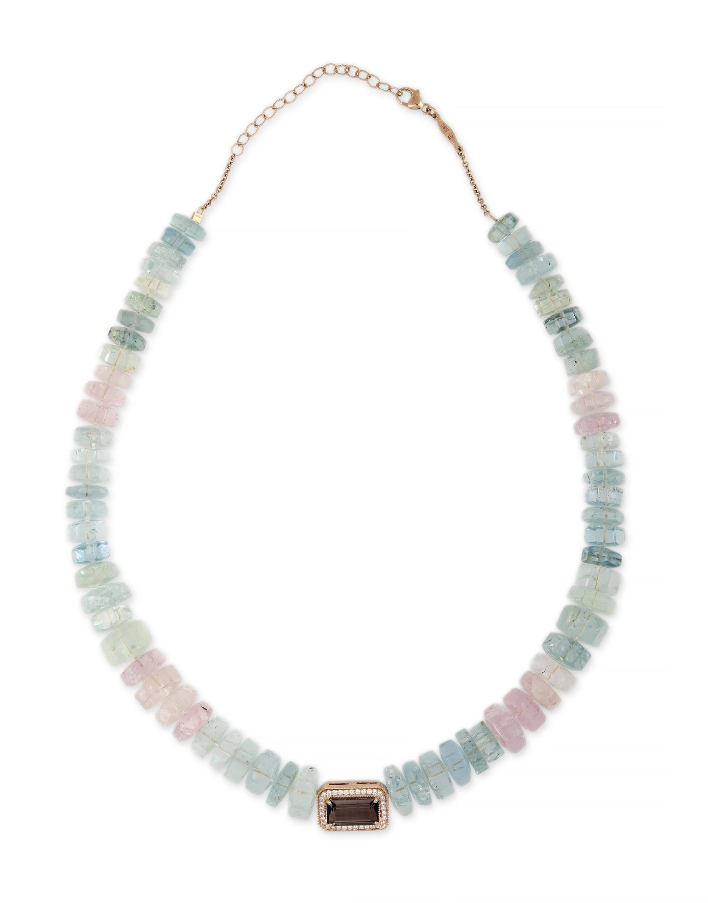 Jacquie Aiche diamond and purple tourmaline rectangle center faceted heishi beryl beaded necklace.