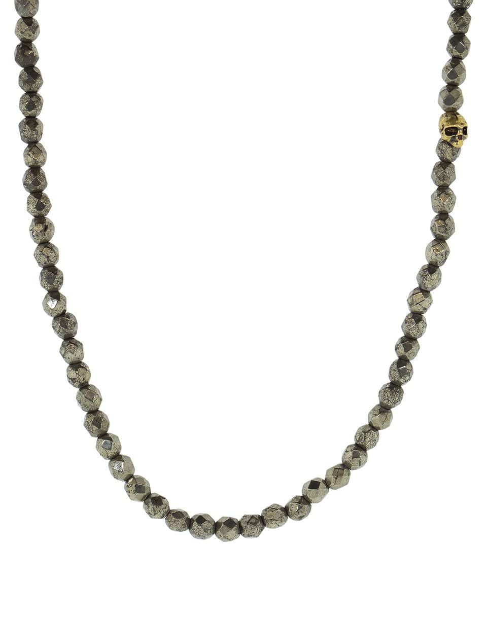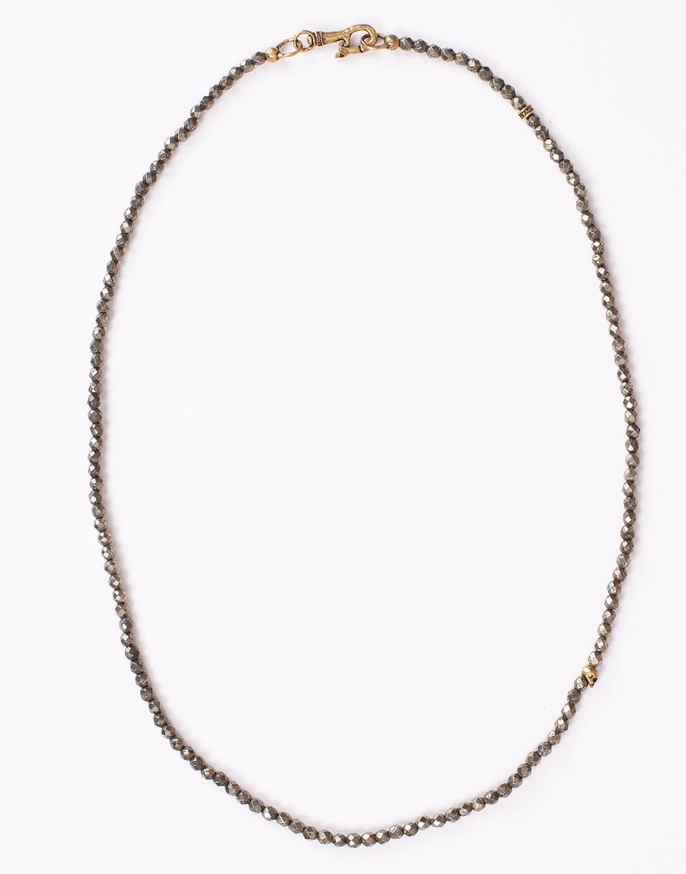 4mm pyrite and brass skull bead necklace with fold over skull clasp from John Varvatos.