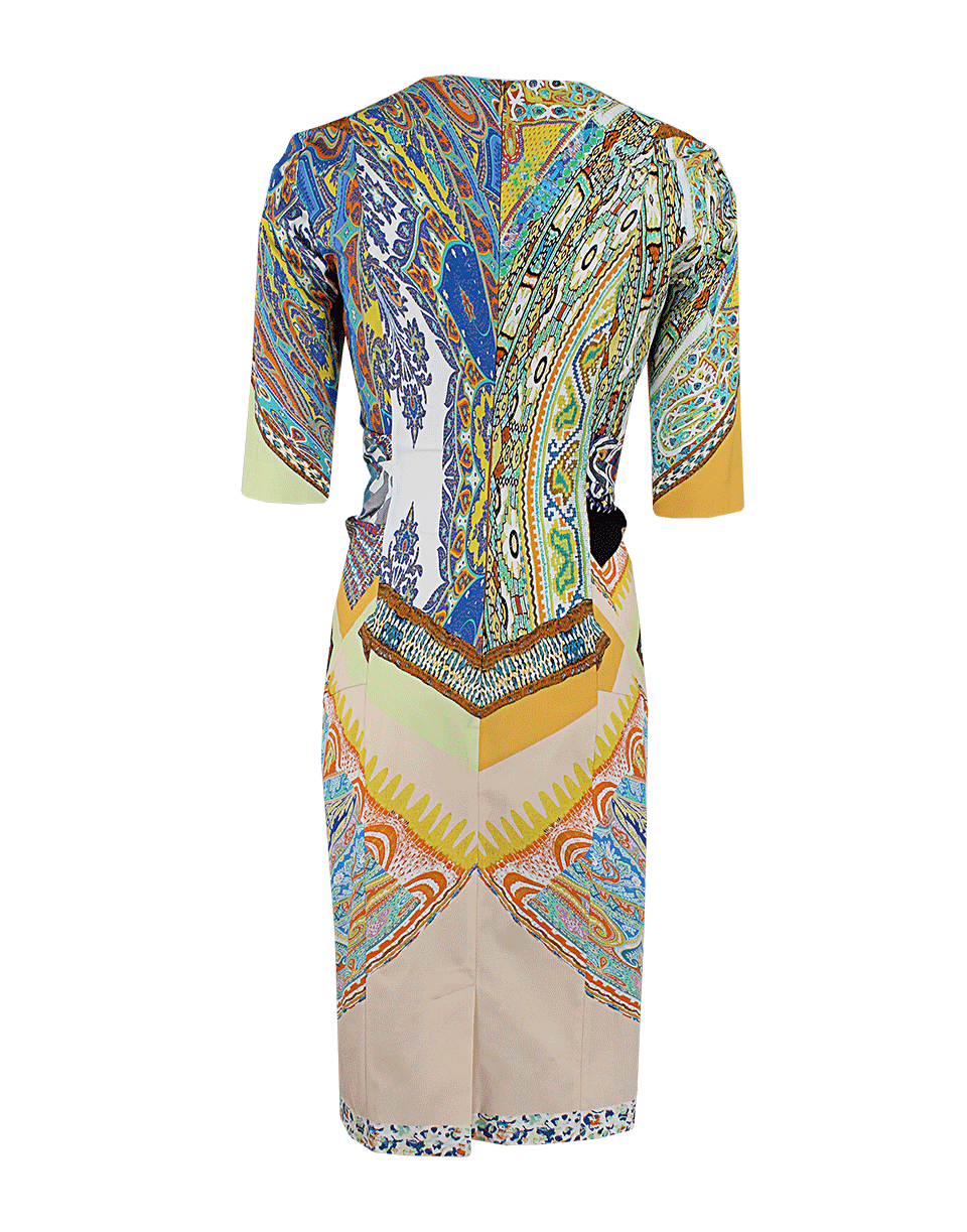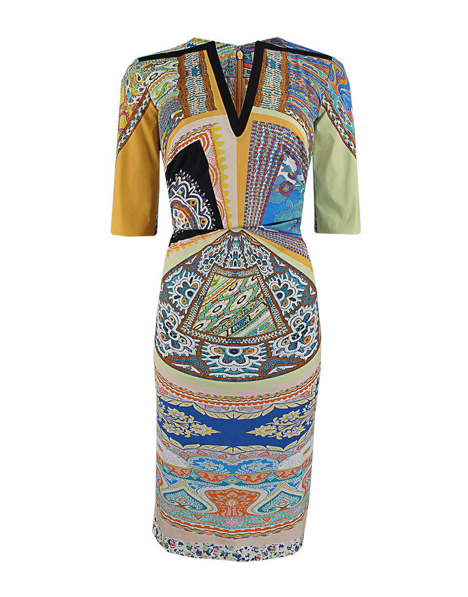 Get inspired by the mesmerizing design of this quarter sleeve banded v-neck print dress by Etro. A perfectly polite dress for a luncheon, pair this tasteful dress with suede booties and prim hat.