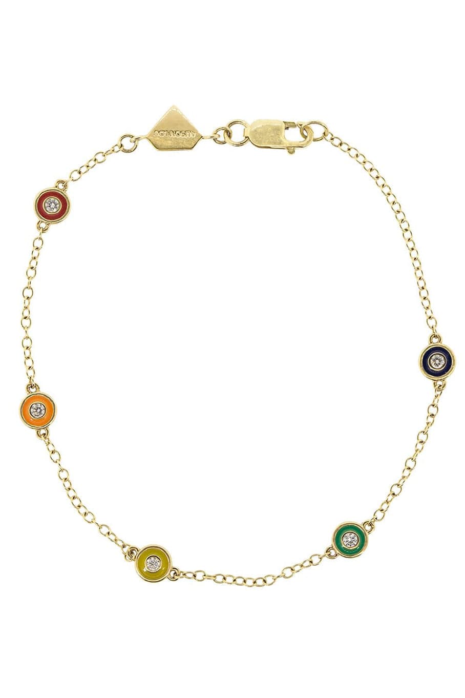 Alison Lou rainbow enamel diamond bezel bracelet set in 14k yellow gold.