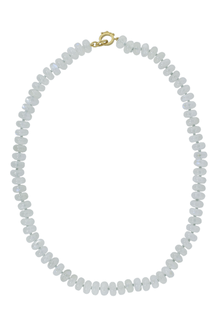 Irene Neuwirth necklace with 8mm rainbow moonstone beads. 16" length and circle hinge fastening.