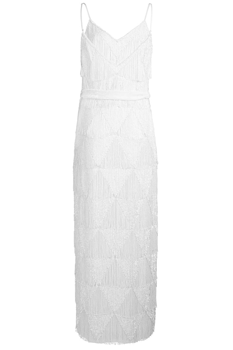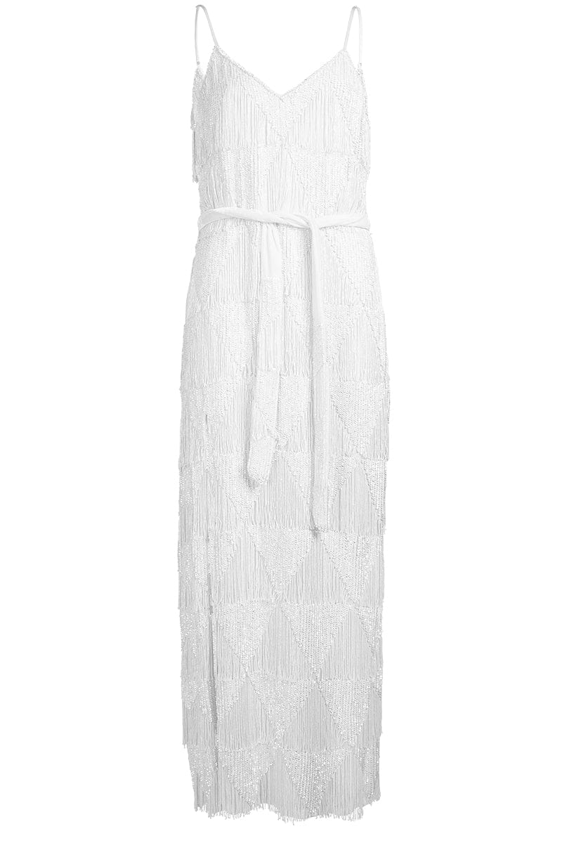 Retrofete rebecca slip dress with slit in white fringe.