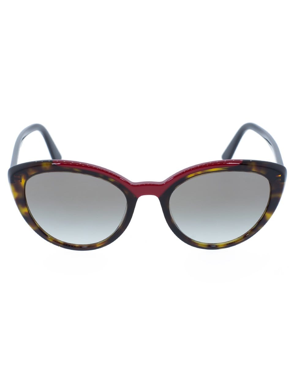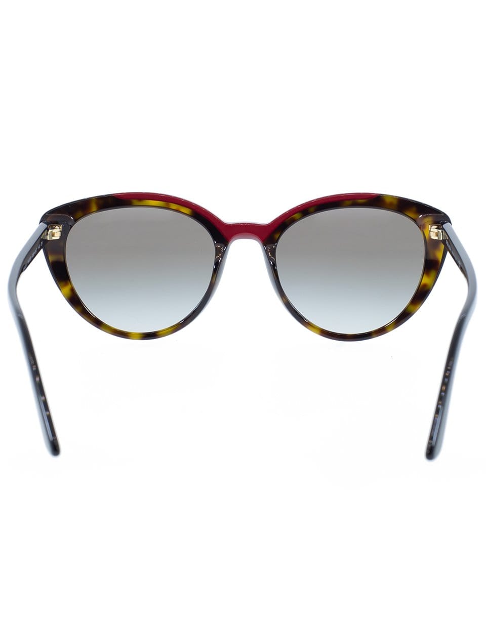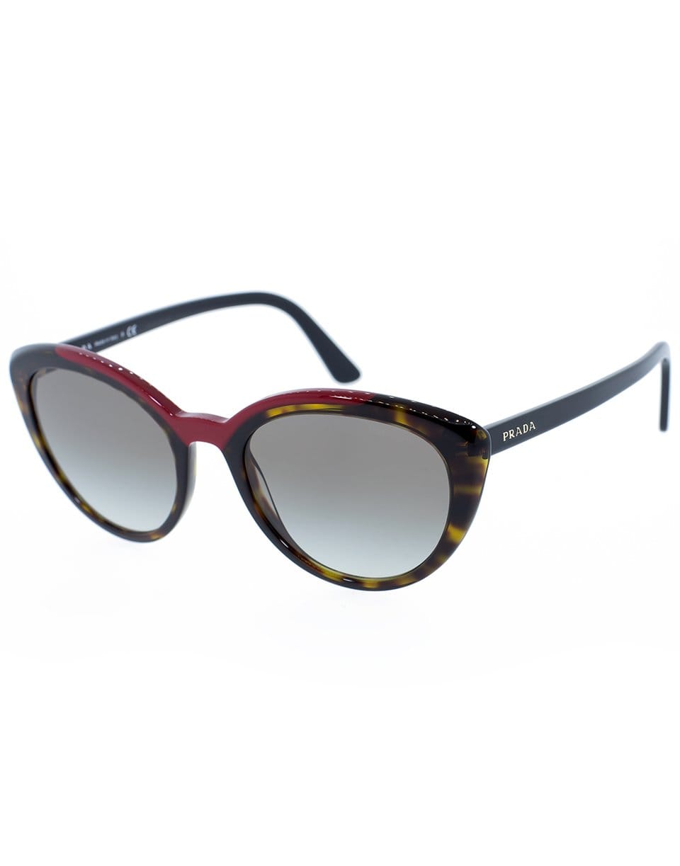 Prada cat eye tortoise shell sunglasses with red acetate detail and gradient gray lenses.