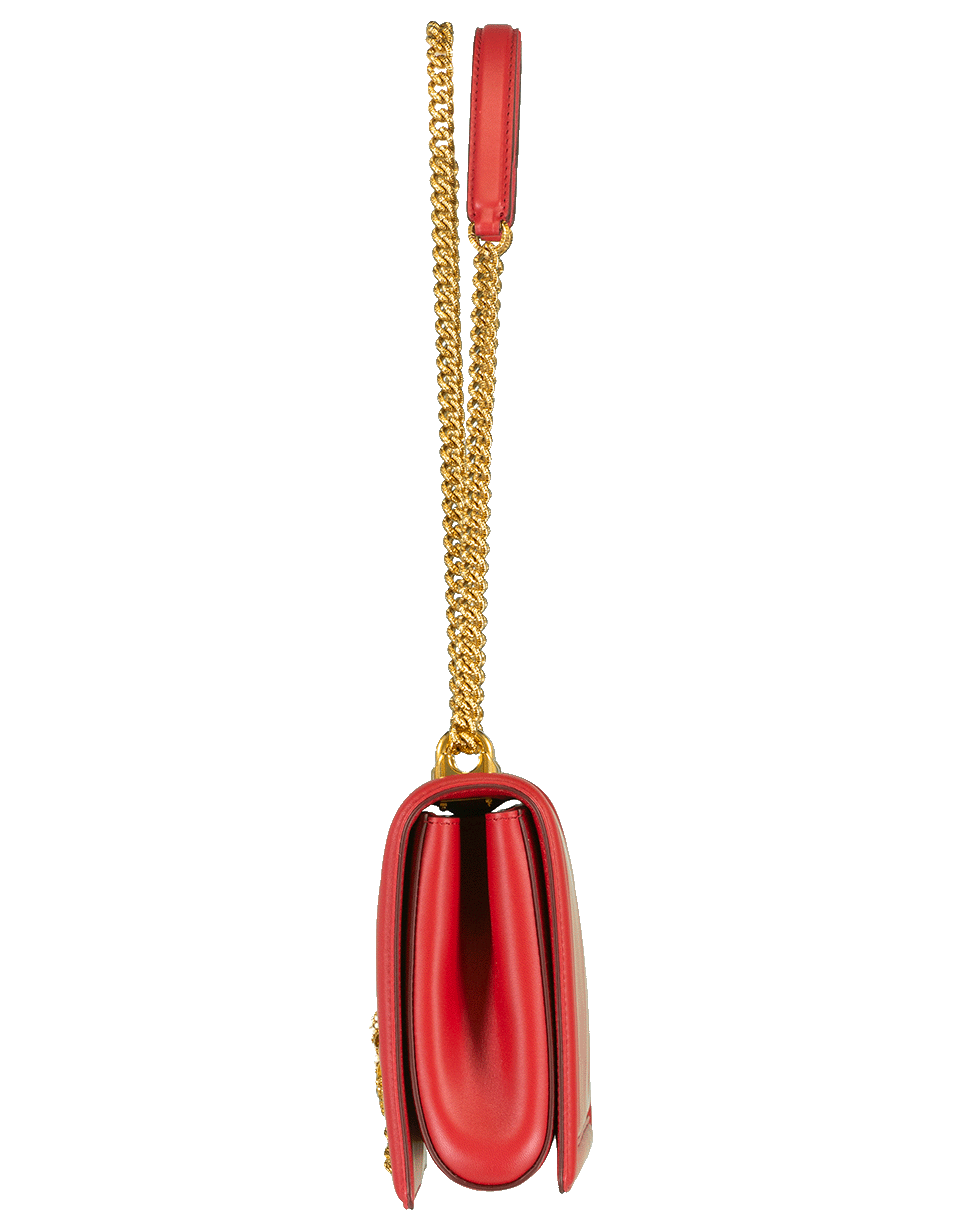 This medium leather Red ‘Devotion’ quilted shoulder bag from Dolce & Gabbana features a 21” adjustable leather and gold-tone shoulder chain and embellished branded heart with an inlay of pearls on the front. A hidden magnetic fastener opens to reveal a large compartment and a zip pocket to store your essentials.