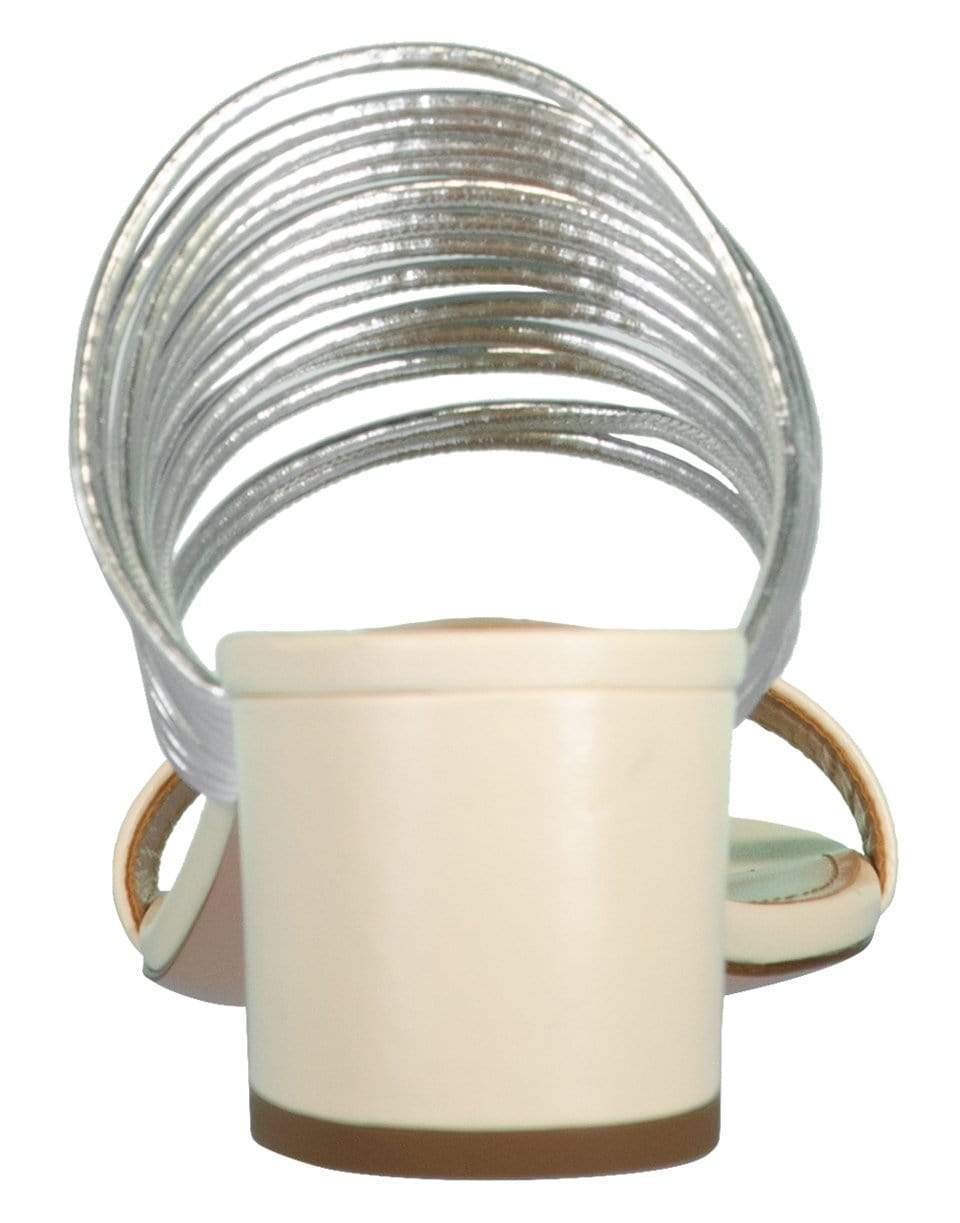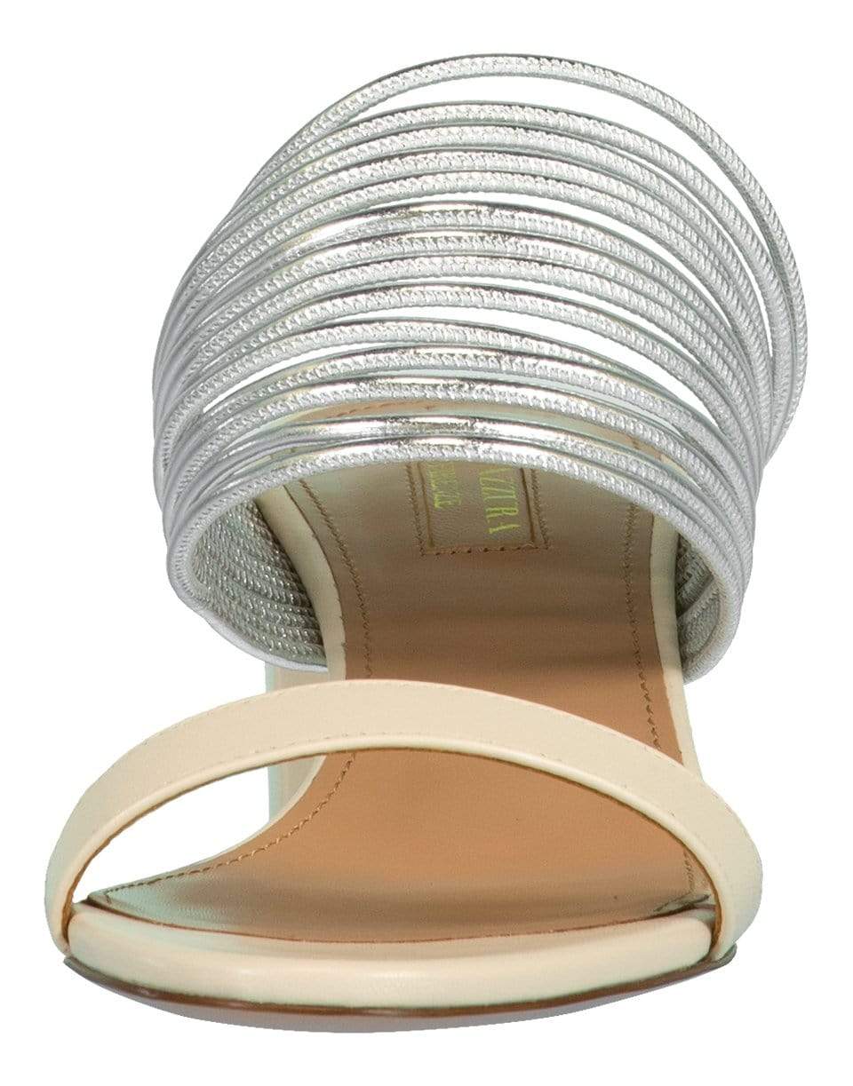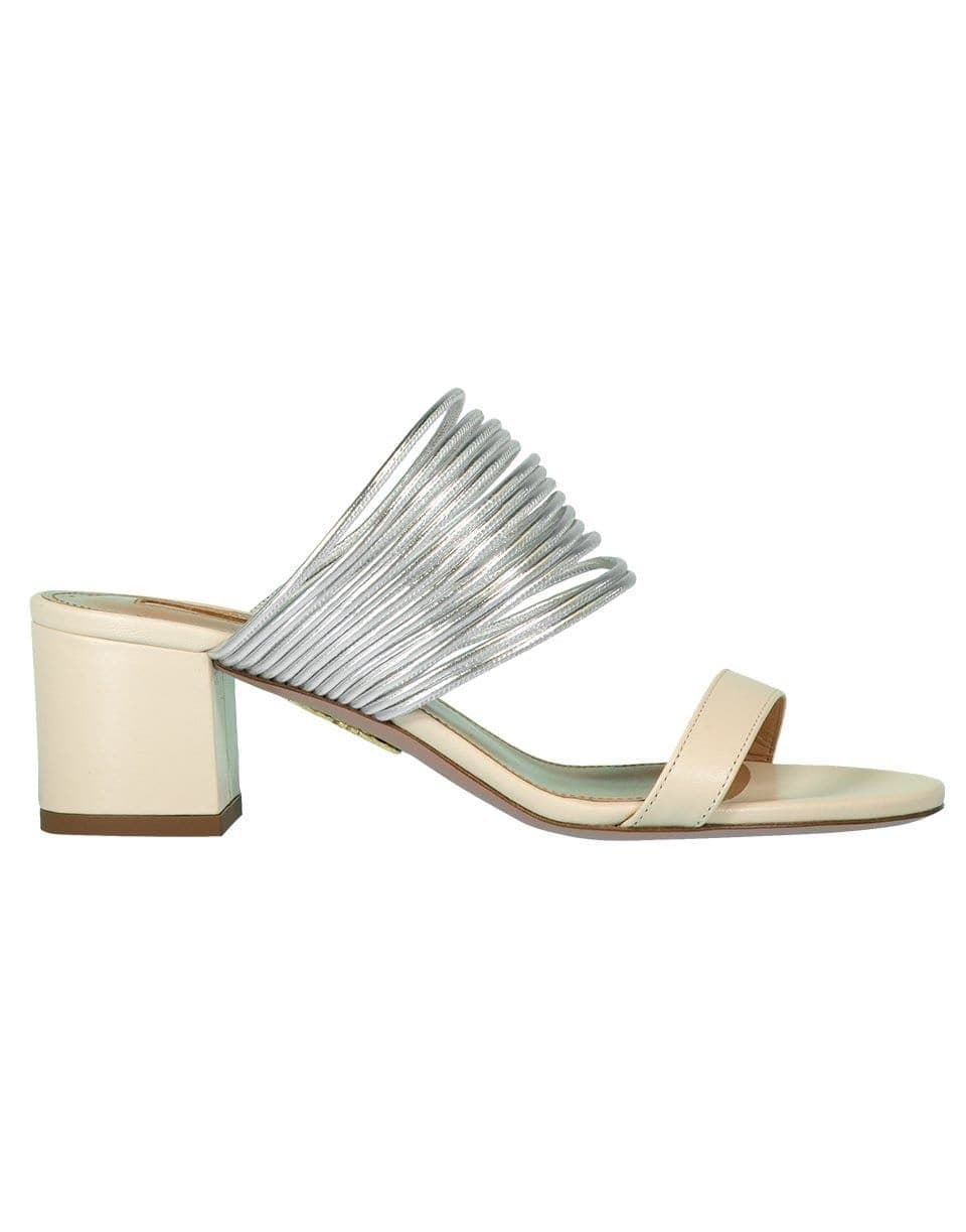 The Rendez Vous leather sandal from Aquazzura is designed with comfortable a mid block heel and adorned with eye-catching shiny metallic coils at the upper.