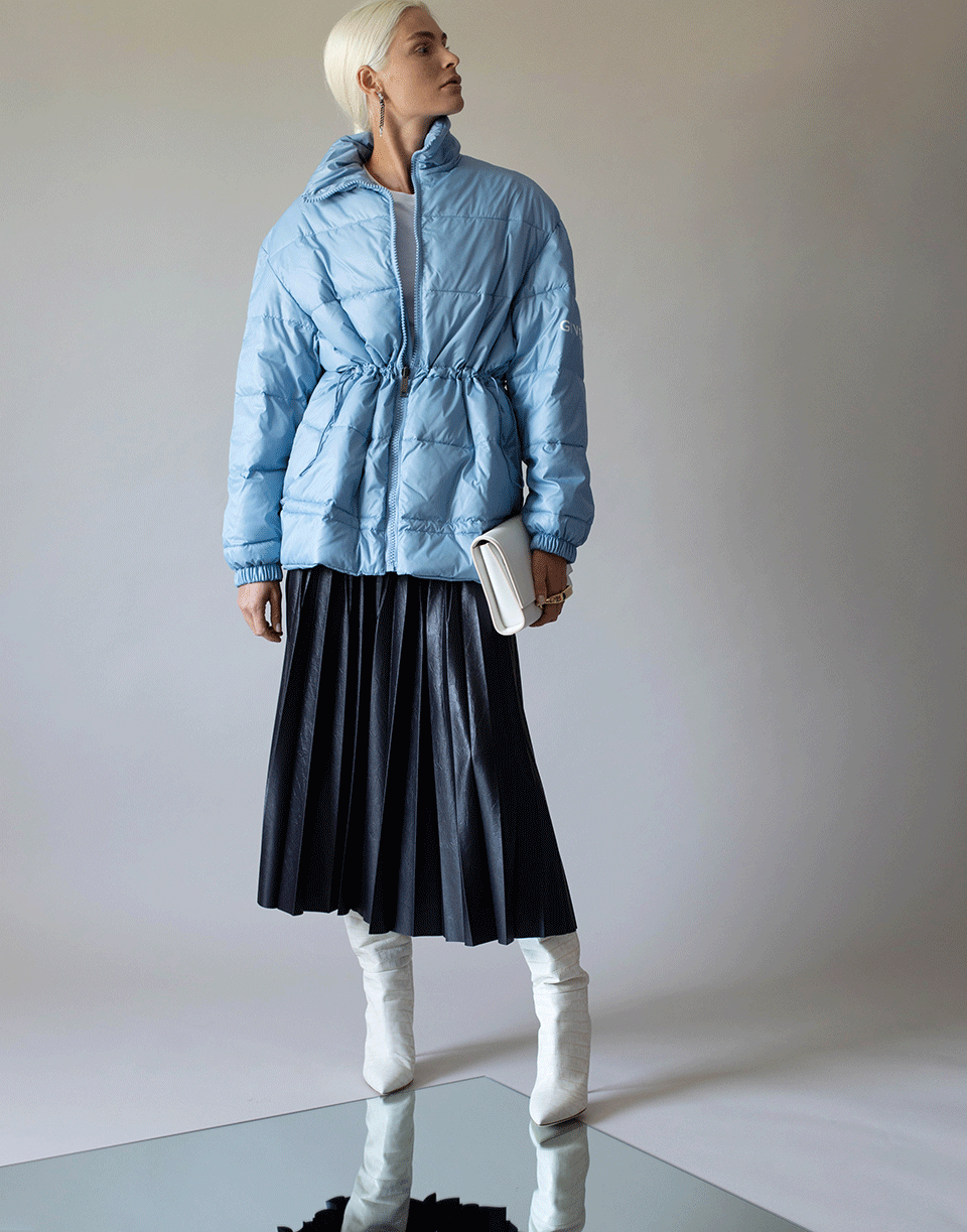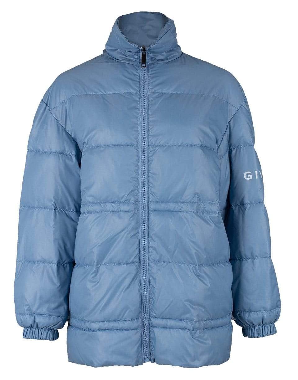 Givenchy light nylon light blue reversible pufer jacket with logo featuring a quilted and matte design, long sleeves, front zip closure, high neck, side pockets, and an oversized fit.