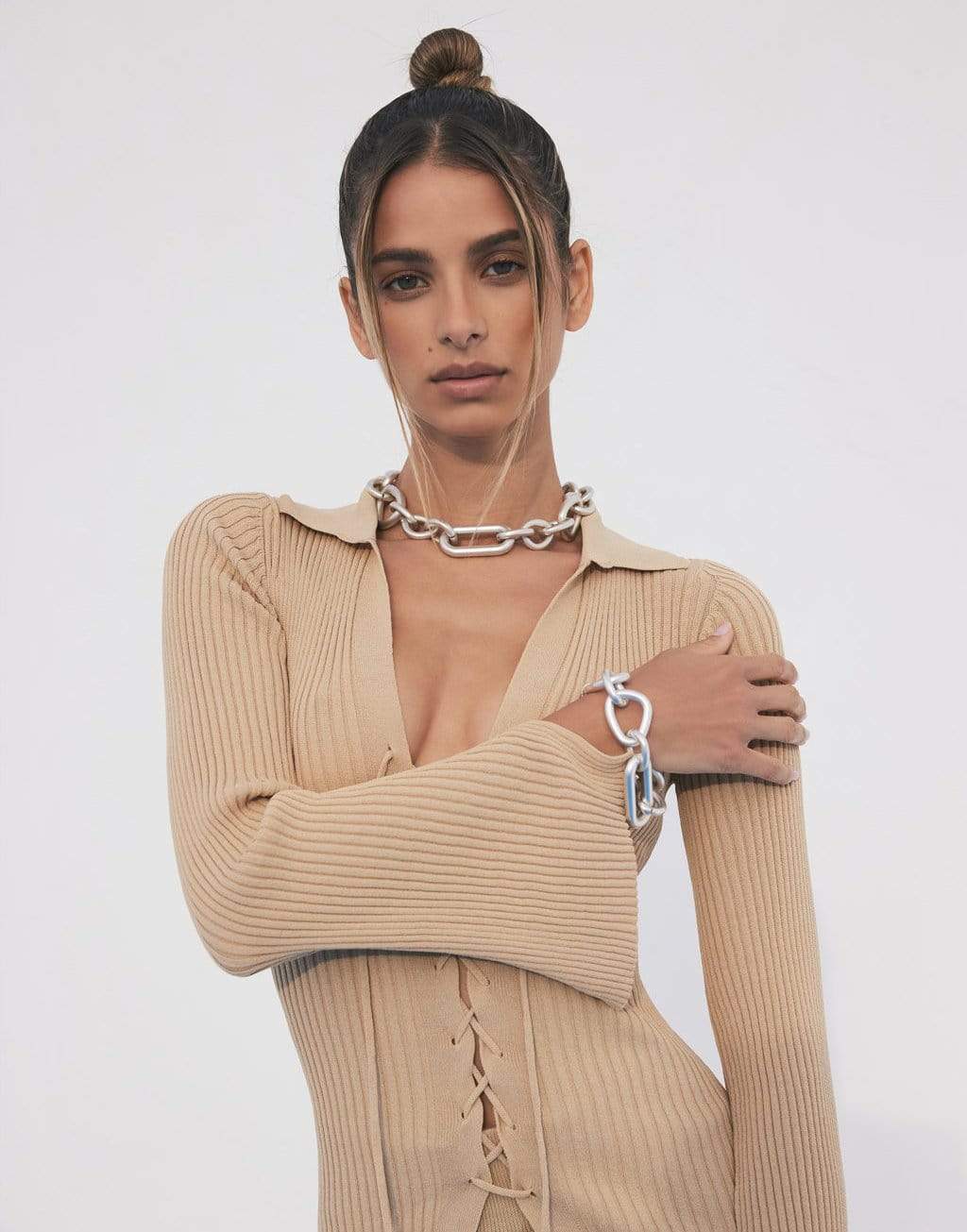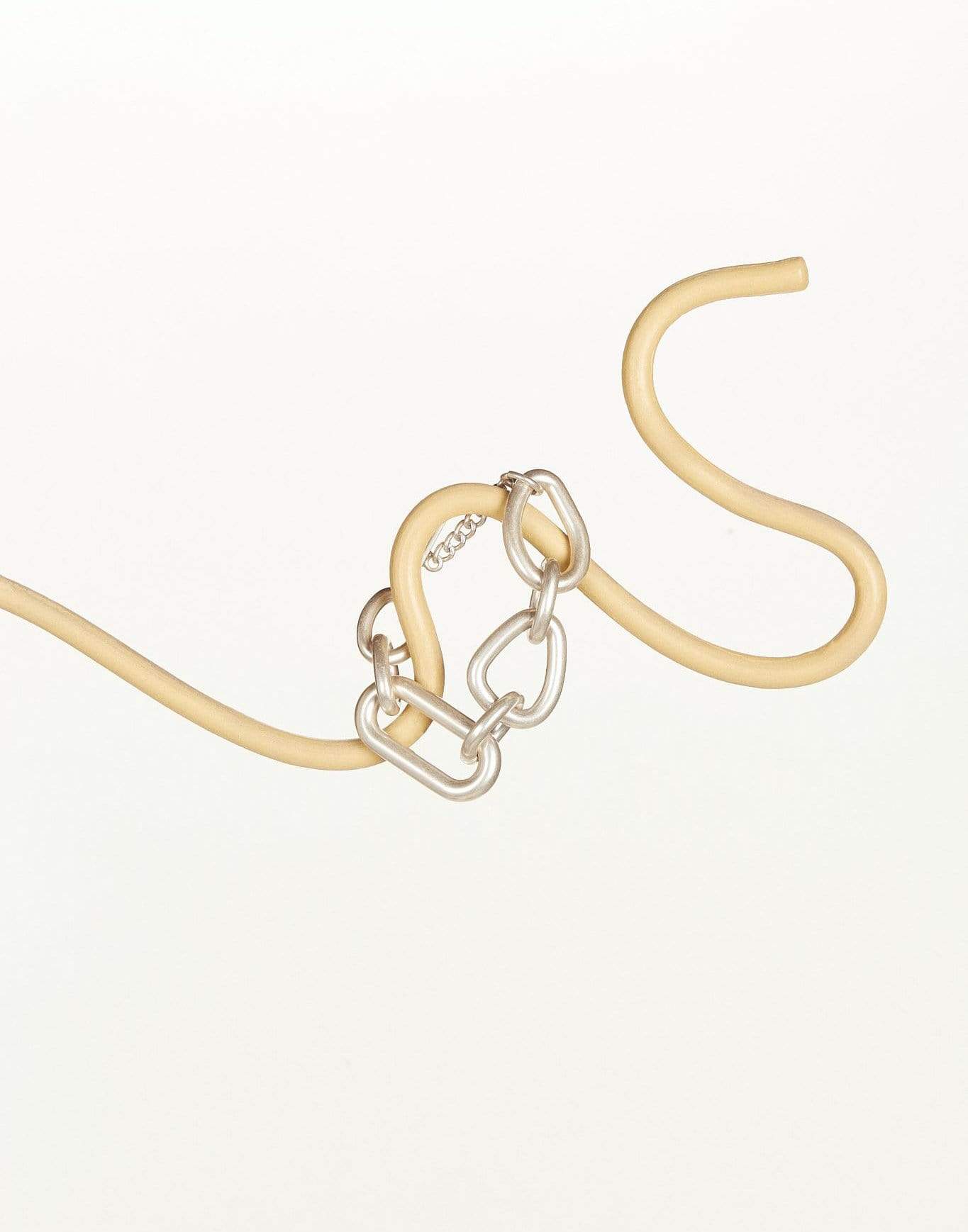 Cult Gaia silver reyes bracelet. Created with stunning brushed silver hardware, the Reyes Bracelet features an interlocking silver chain. Easily adjustable to be worn for a tighter or looser fit. Pair with Reyes Earrings and Necklaces.