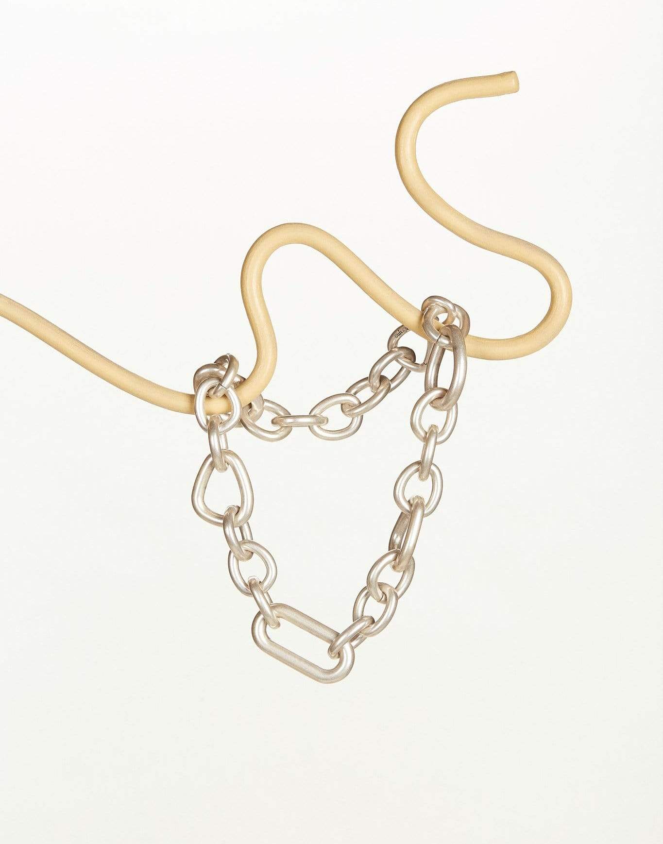 Cult Gaia silver reyes necklace. Created with stunning brushed silver hardware, the Reyes Necklace is a show-stopping piece featuring interlocking brushed silver chain-link design. Pair with matching the Reyes Bracelet or Reyes Earrings and a shoulder-baring top. Easily adjustable to be worn for a tighter or looser fit.