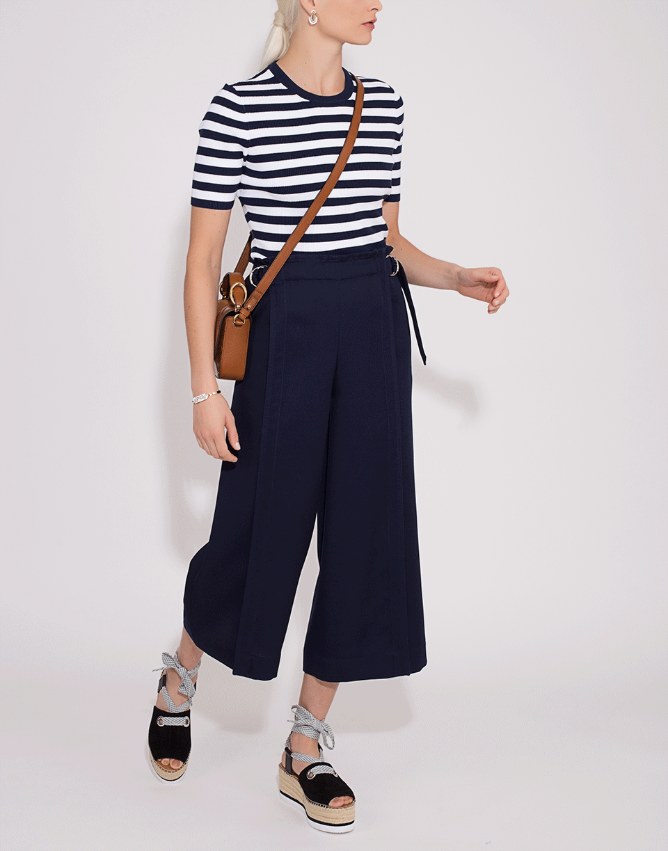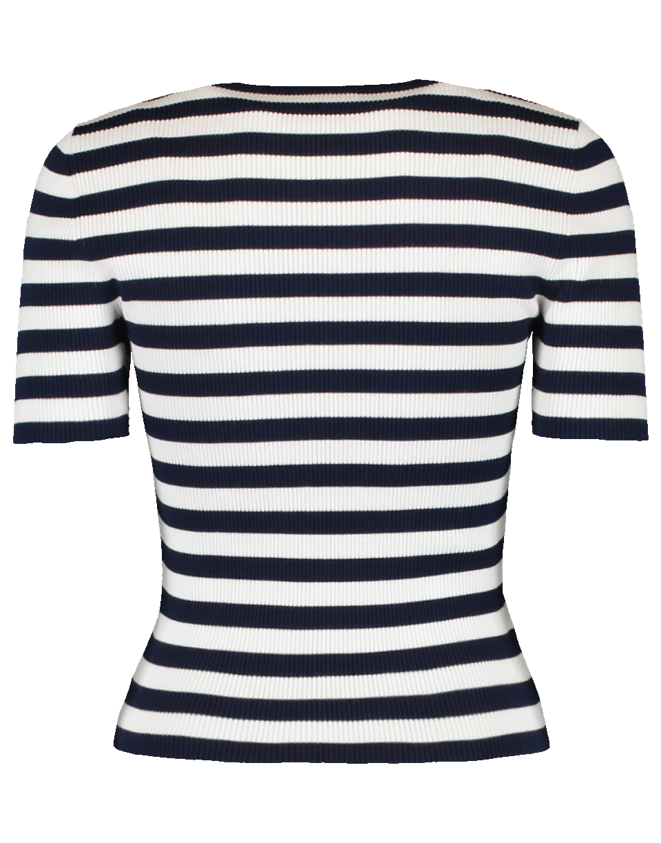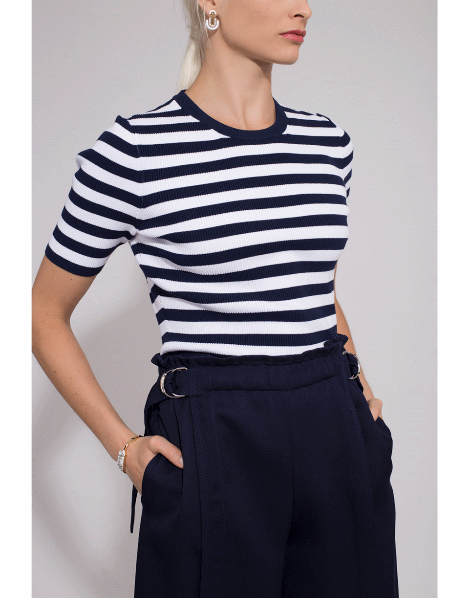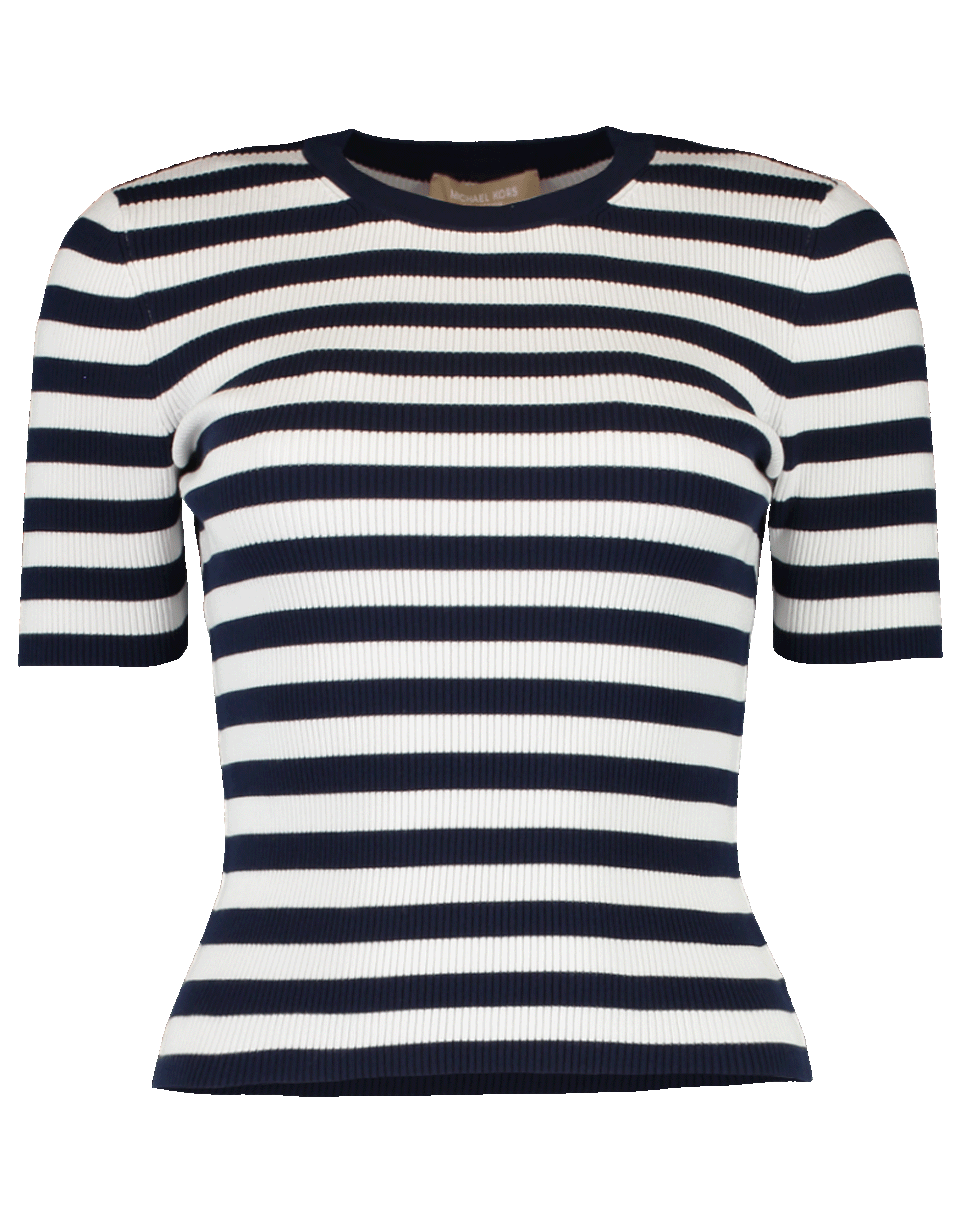 Ribbed stripe crewneck knit top by Michael Kors. This classic striped short sleeved crewneck is a necessity in every wardrobe. It features a pullover style with a stretch slim fit silhouette and a round neckline.