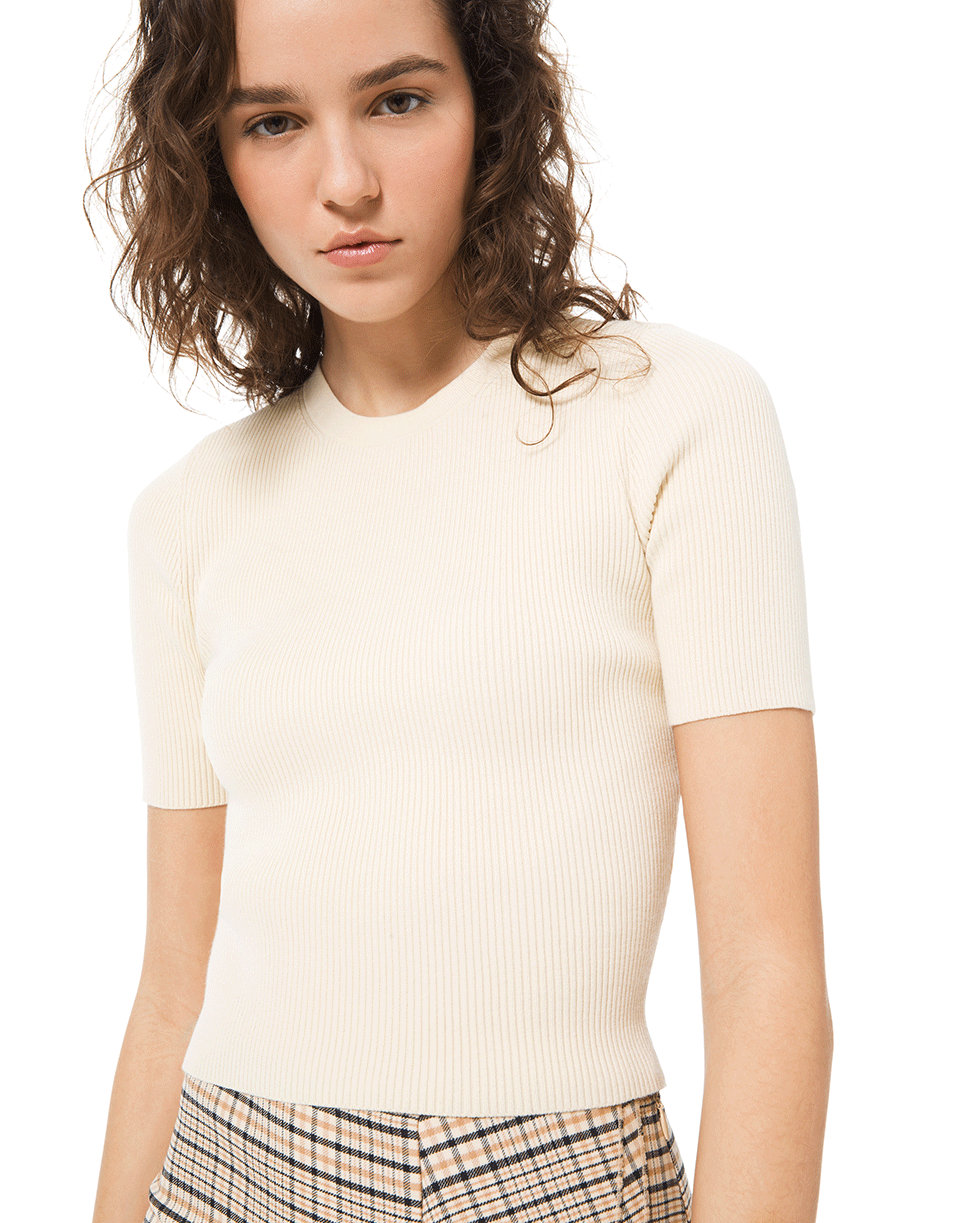 A cozy basic perfect for year round wear. This stretch viscose tee from Michael Kors Collection features short sleeves, a crewneck, slim fit, and a ribbed design throughout. Style it with anything from cropped pants to a pleated skirt.