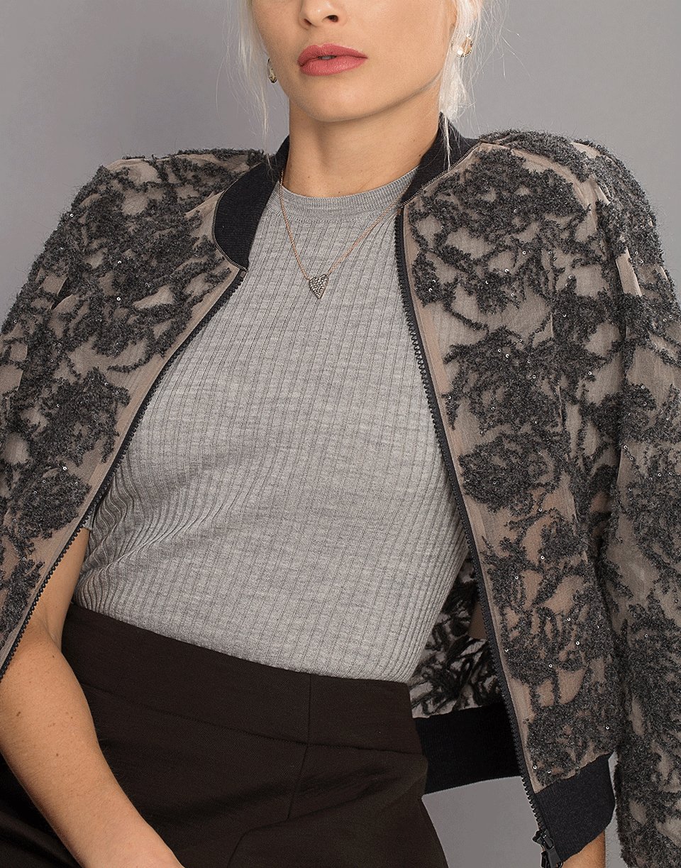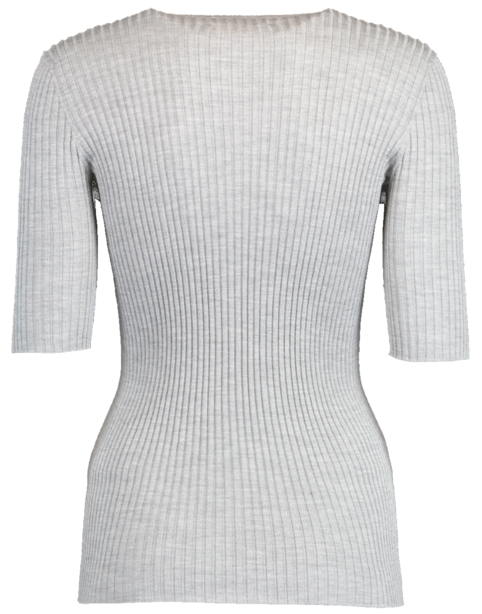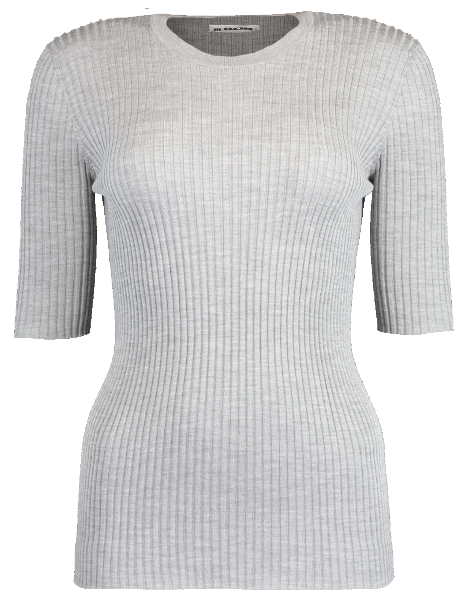 Grey ribbed pullover from Jil Sander featuring a slim fit with elbow length sleeves, round neckline, and straight hem.