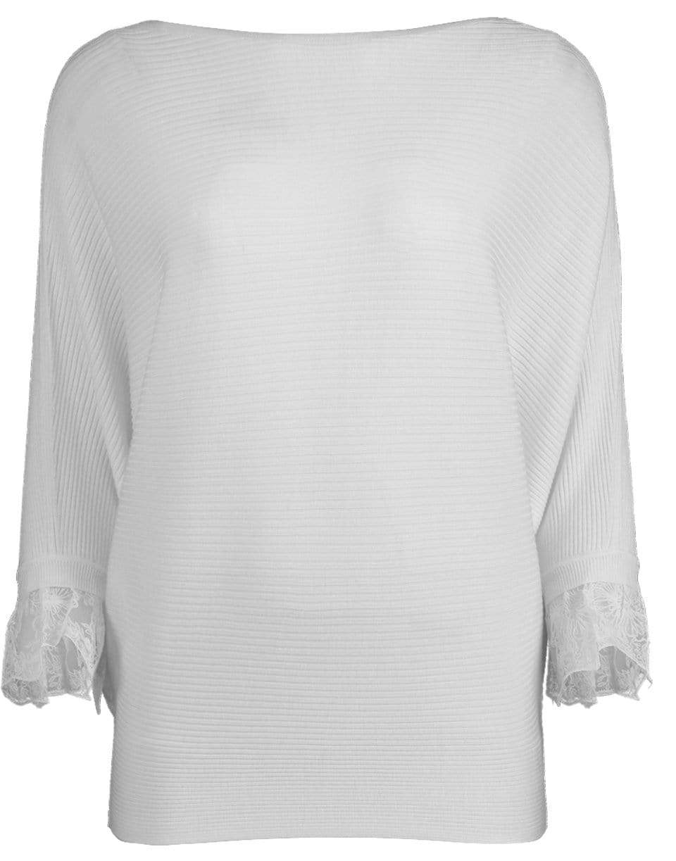 Chloe ribbed pullover sweater in Iconic Milk featuring a boatneck, long sleeves with lace cuffs, and a regular fit.