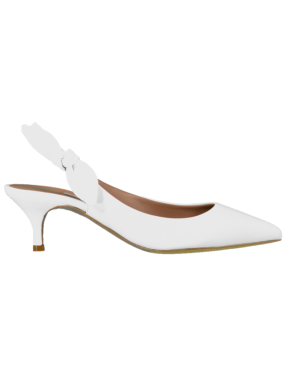 White kitten heel by Tabitha Simmons designed with calf leather, a slingback style, pointed toe, 60mm heel and a bow accents on the side.