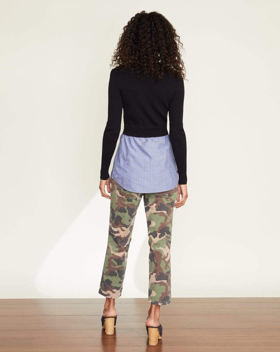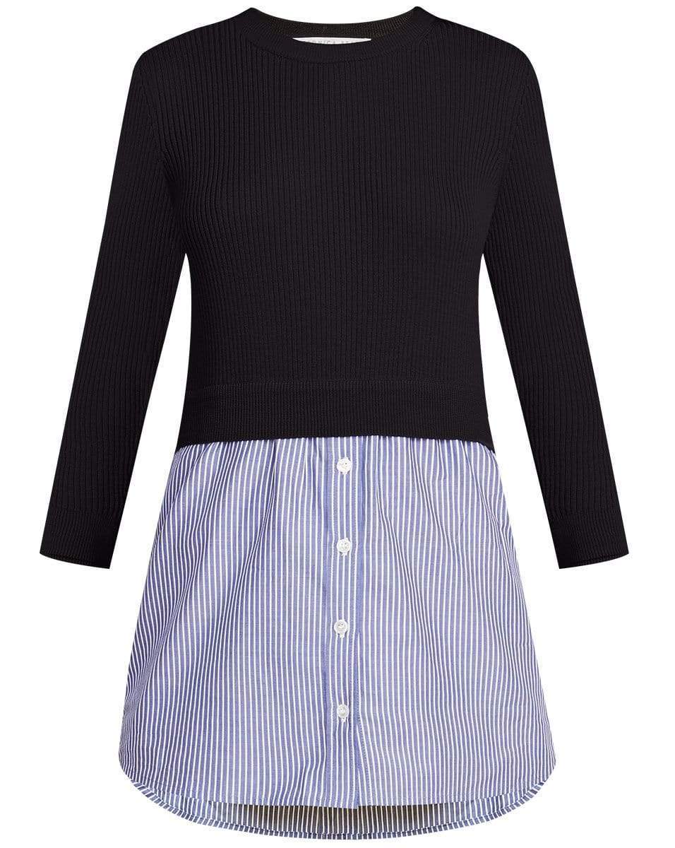 Veronica Beard rocha mixed media pullover in navy. The Rocha mixed-media pullover features a merino wool top paired with a poplin underlayer. Wear this fashion-forward style with skinny jeans and boots for an easy, everyday look.
