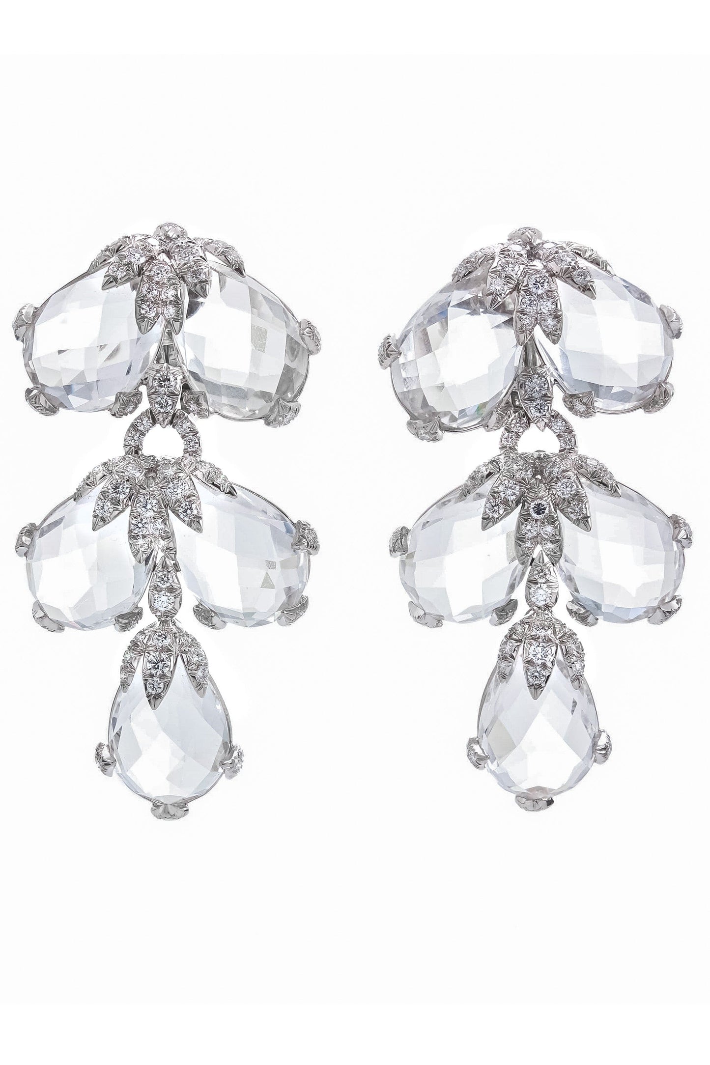 David Webb rock crystal and diamond alpine earrings. Pear-shaped faceted rock crystal, brilliant-cut diamonds, 18K white gold, and platinum.