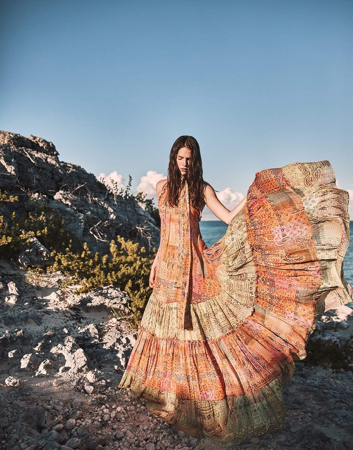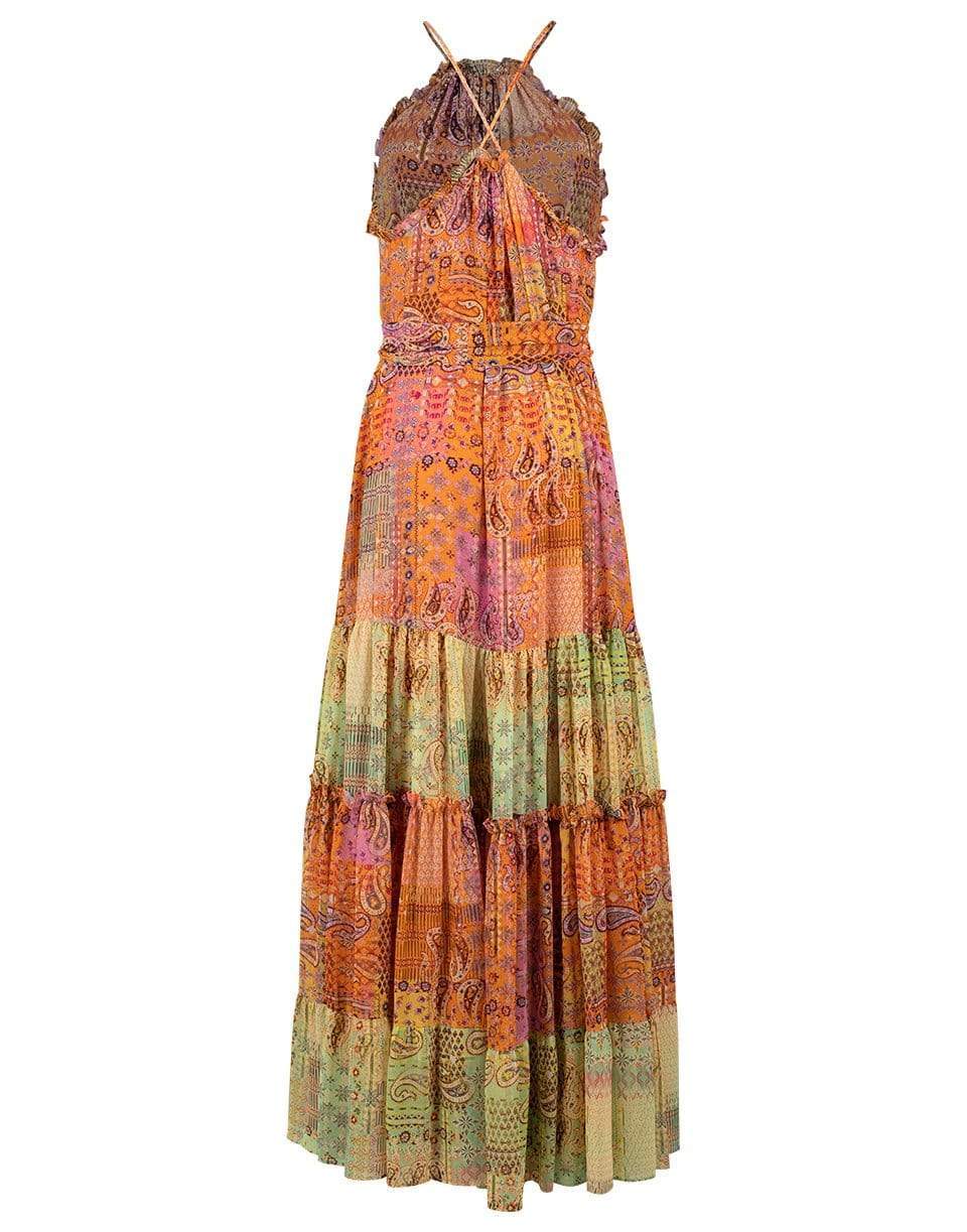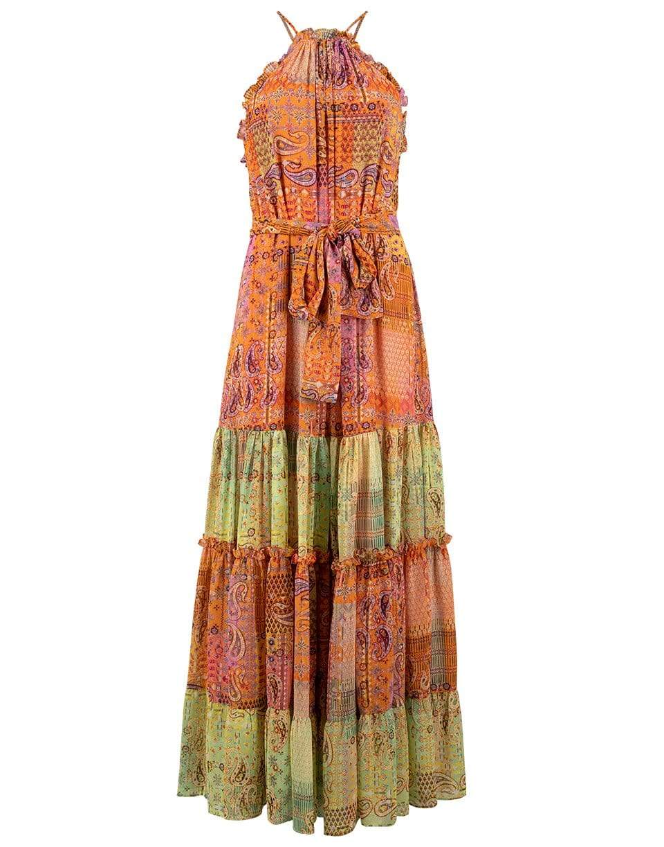 The Alexis Rosaline Printed Linen-Blend Dress features a relaxed fit, tent silhouette, sleeveless, tiered, maxi hemline, and is fully lined.