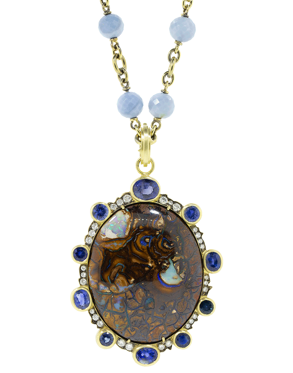 Stunning opal and mixed sapphire pendant with encrusted sparkling brilliant cut diamonds set in 18k yellow gold. Includes a detachable clasp bail.