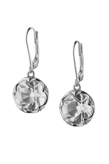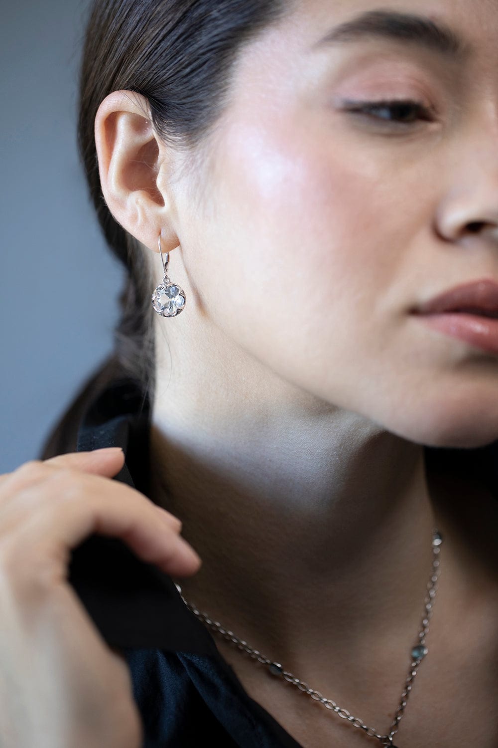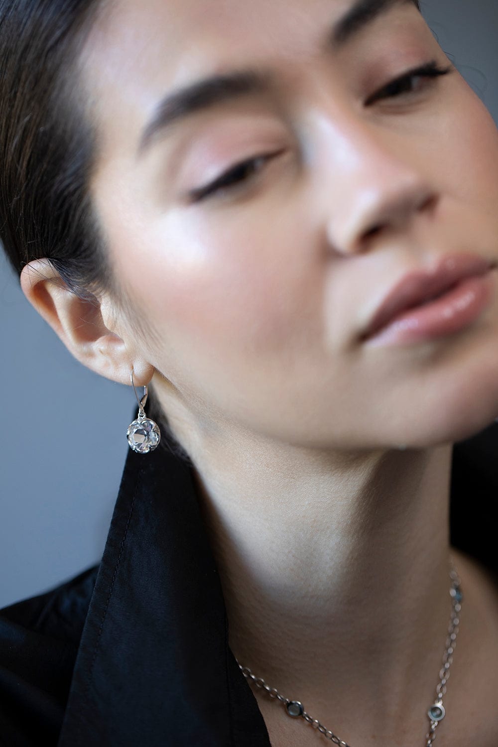 Monica Rich Kosann round cut rock crystal earrings. The "round cut" is inspired by old mine cut diamonds we find in vintage pieces from the early 1900's. Featuring white sapphire accents, tehse earrings are the perfect foundation piece for your wardrobe.