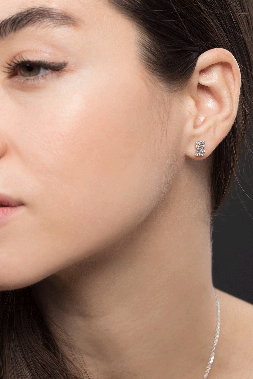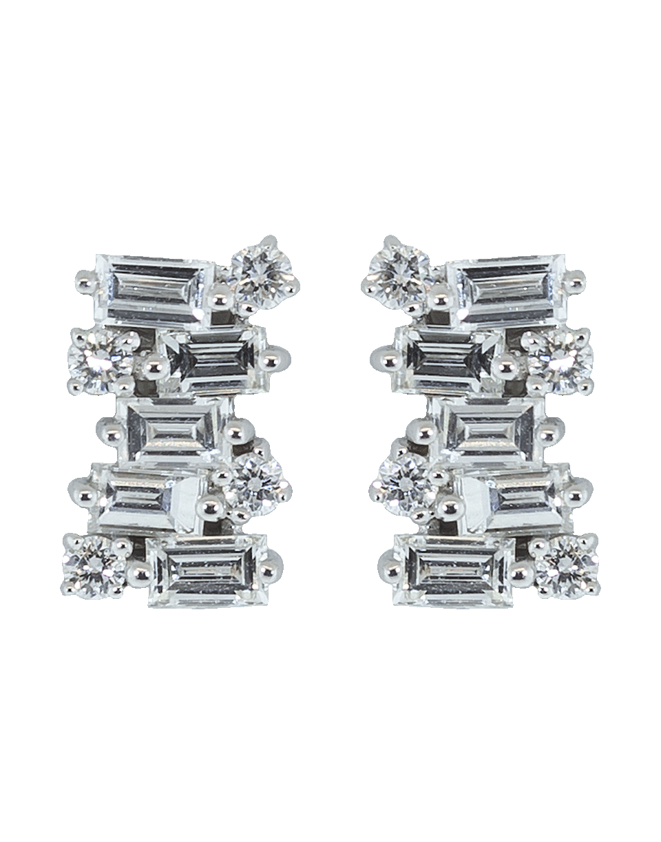 Suzanne Kalan 18k white gold baguette diamond earrings on firework setting. For pierced ears.