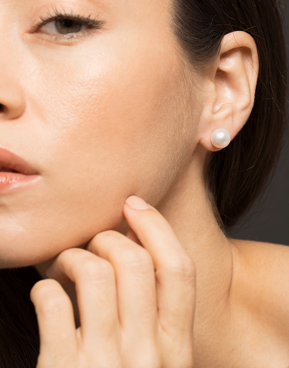 Pearl studs designed by Baggins. These pearl earrings are 8-8.5mm and have push back closures for pierced ears.