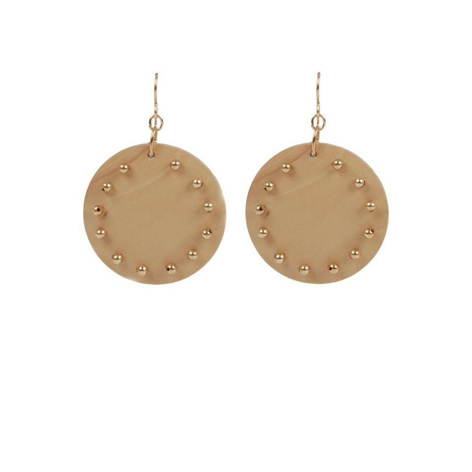 Sample the earthy vibe from Leva’s round wood earrings. Simple, yet updated with tiny gold beads gives these easy statements a hint of shine.