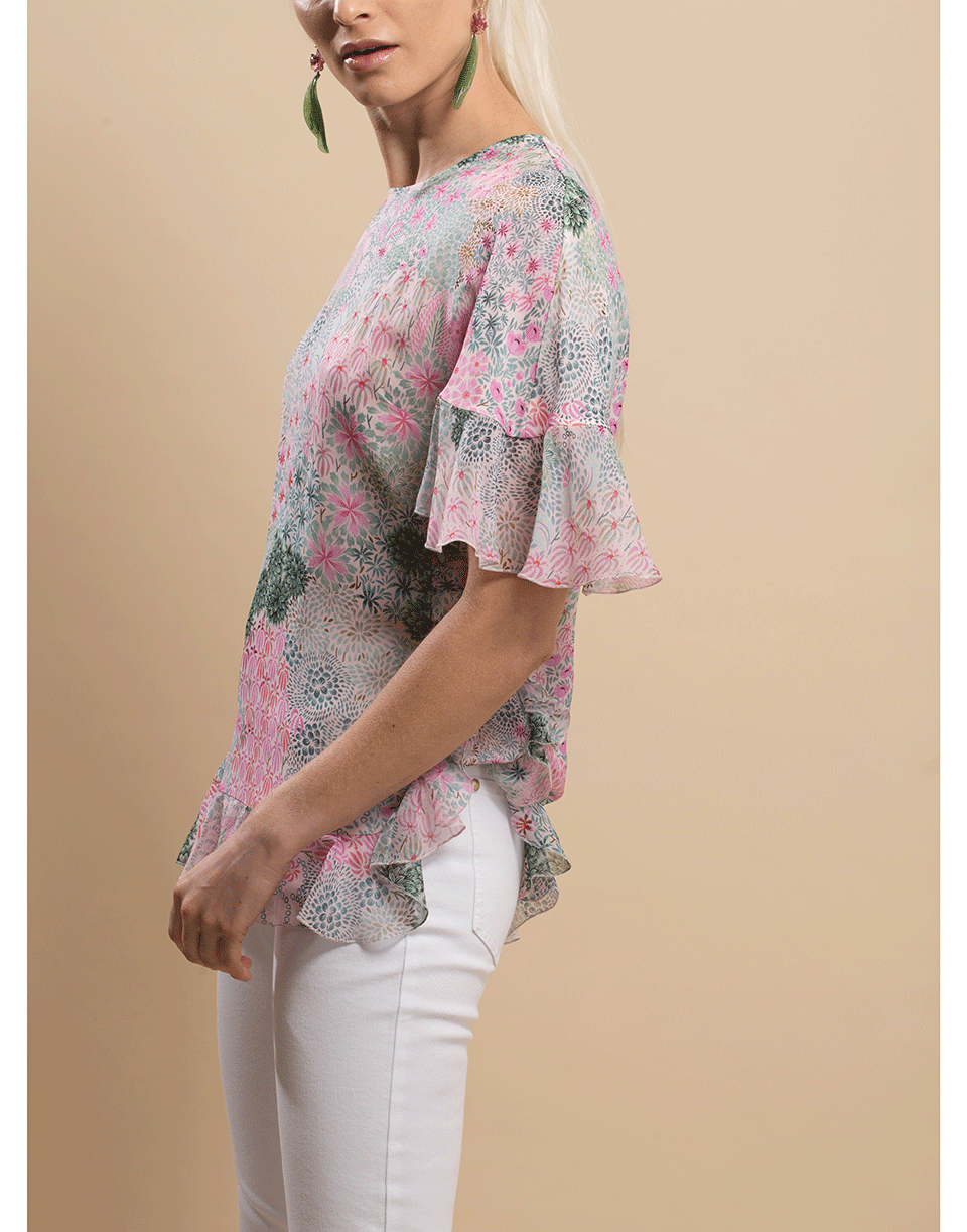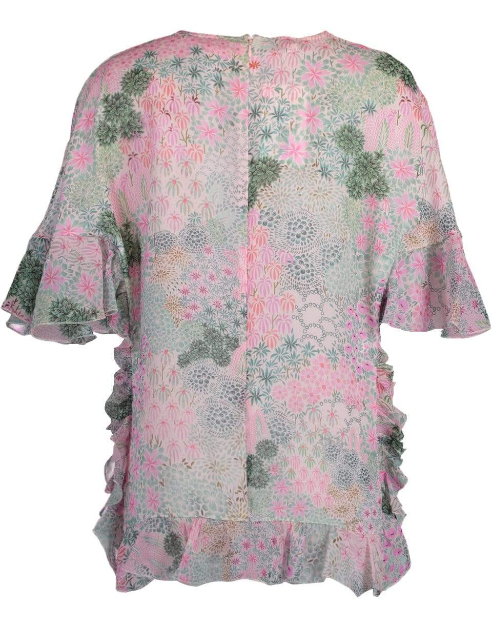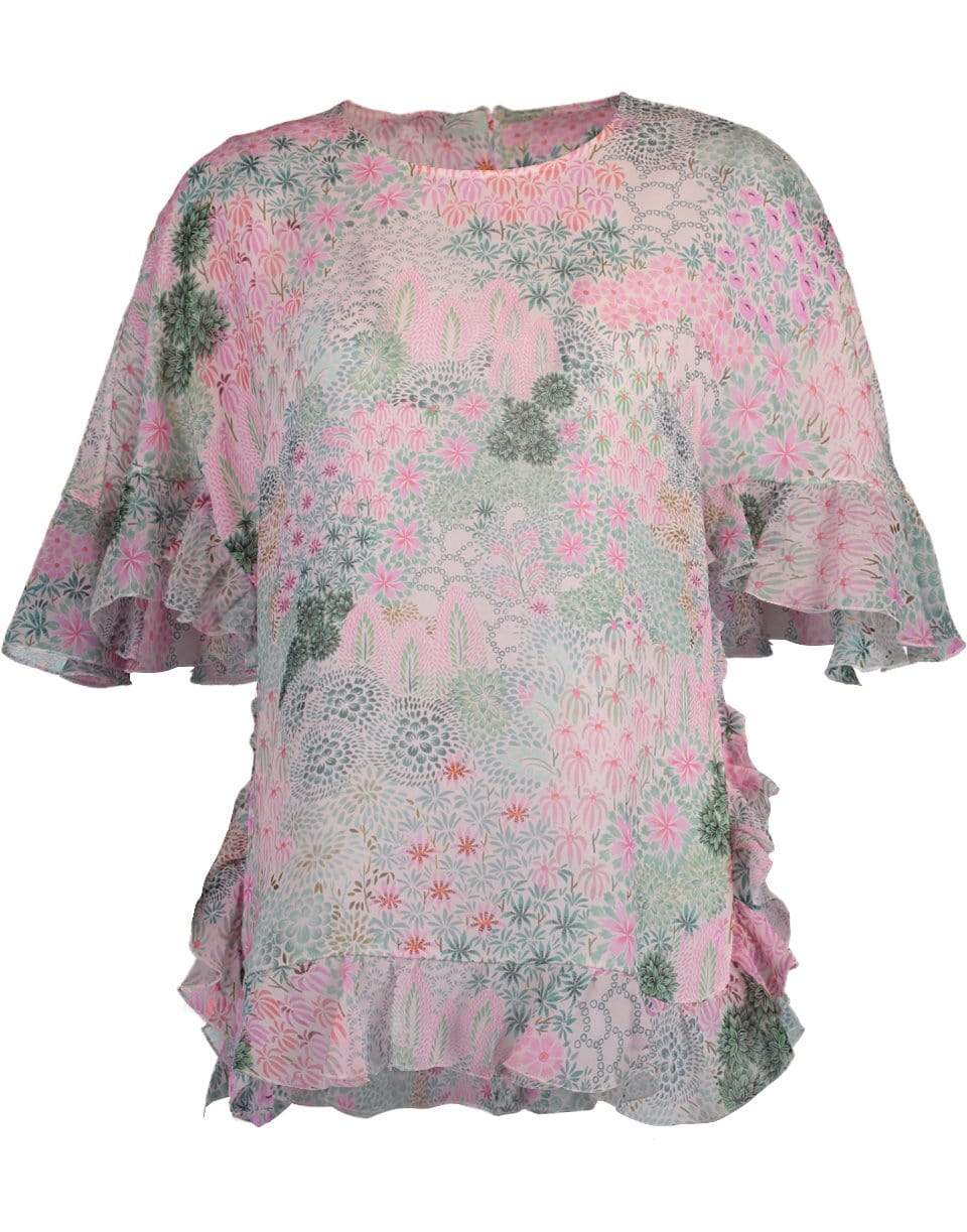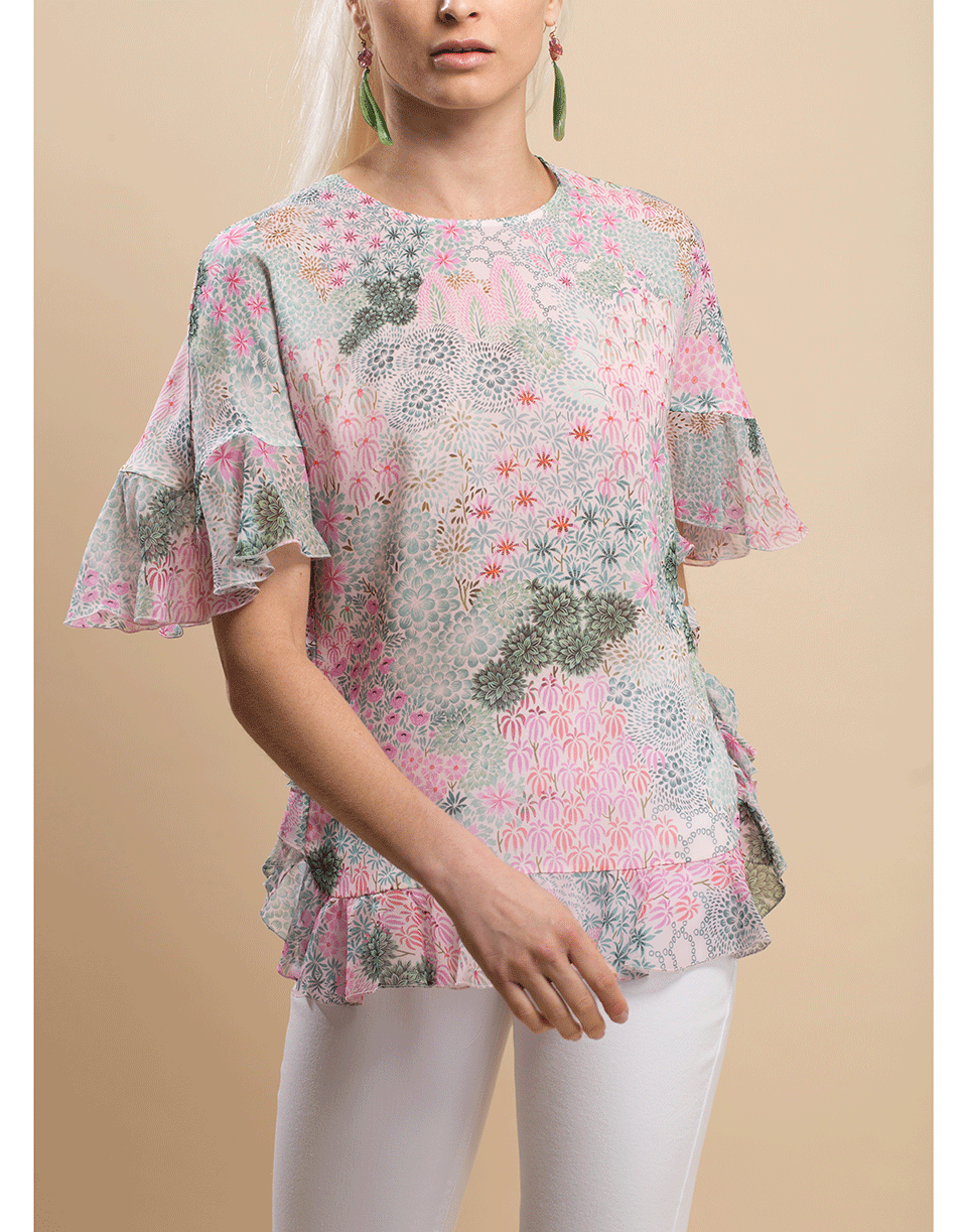 Giambattista Valli georgette printed blouse with ruffled short sleeves and hem, round neck, and a regular fit.