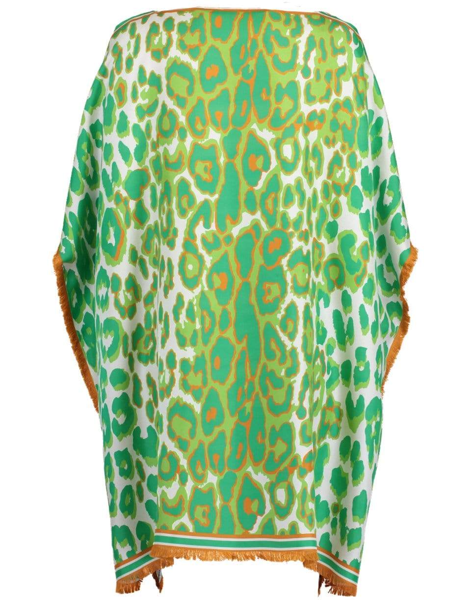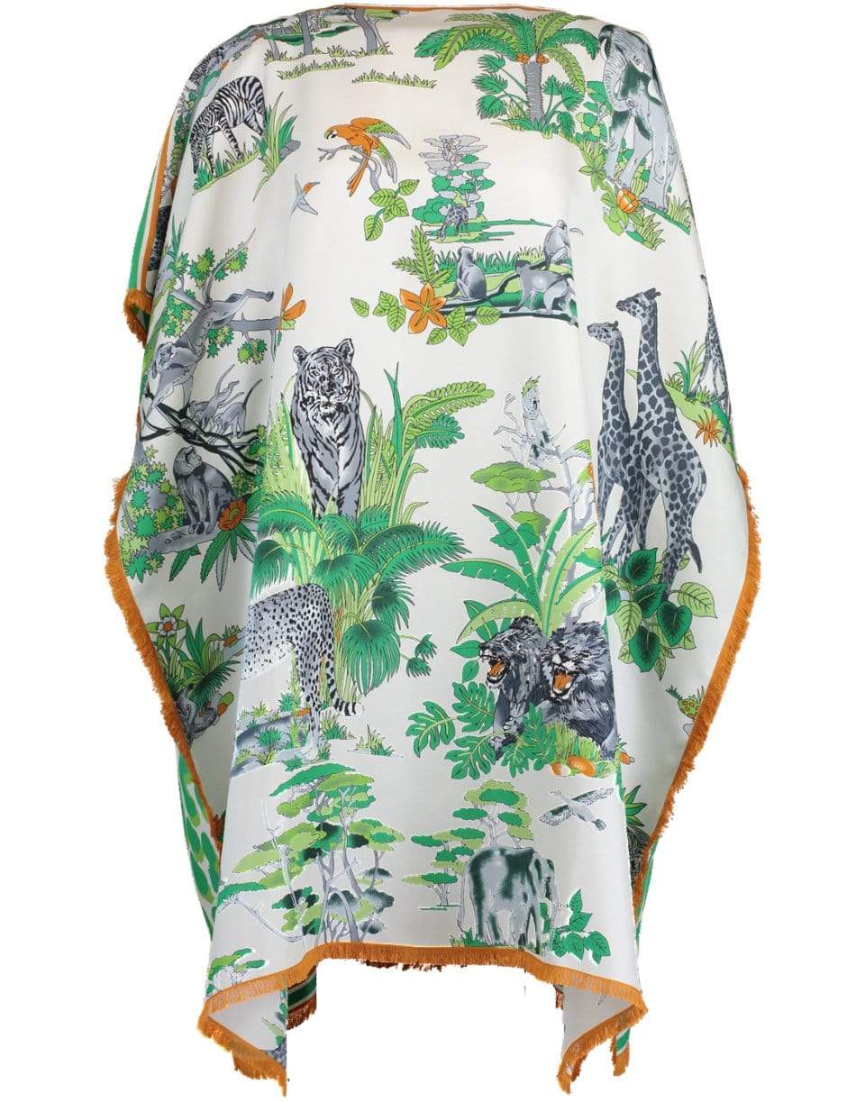 Rani Arabella safari printed silk dress with a relaxed fit, boatneck, draped sleeves, frayed trim, and a short length.