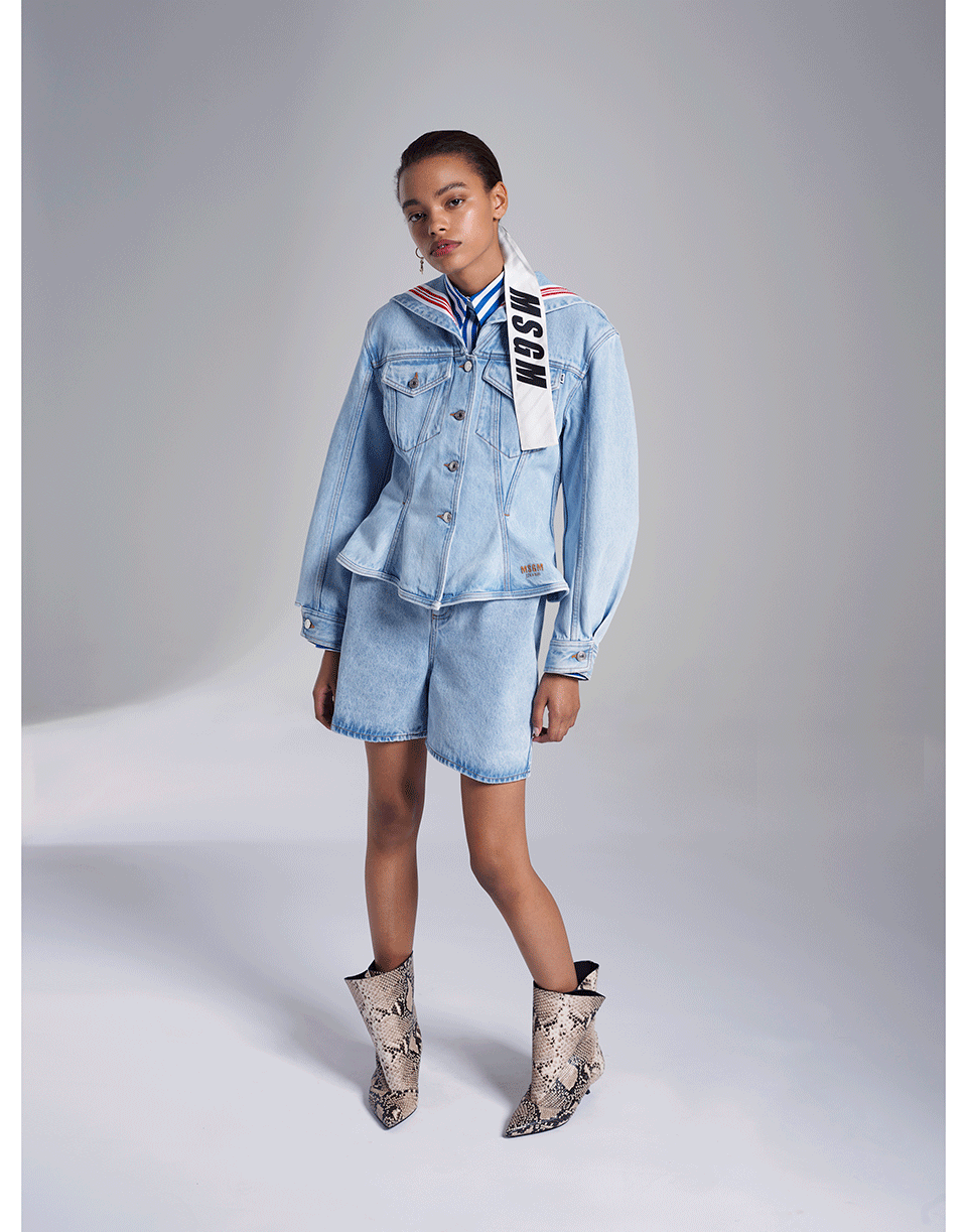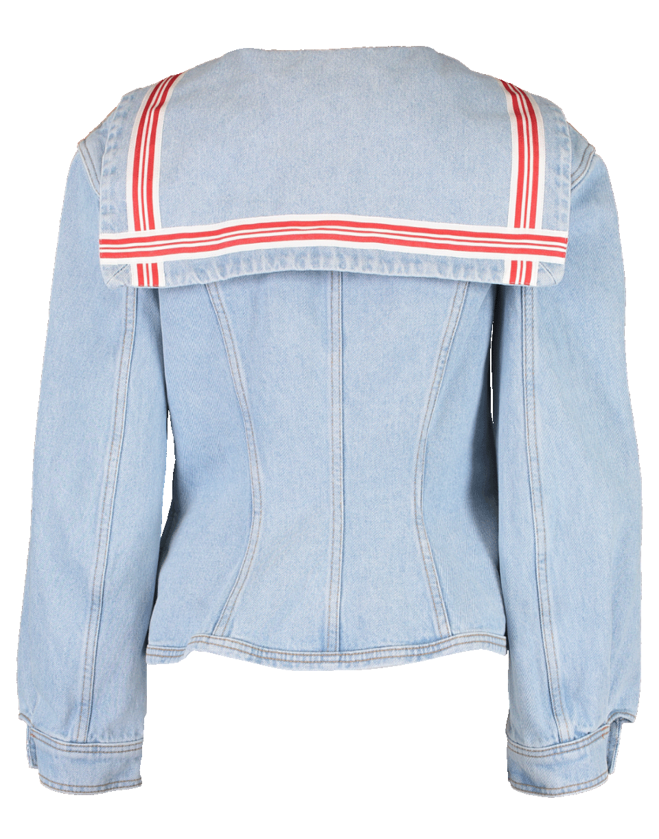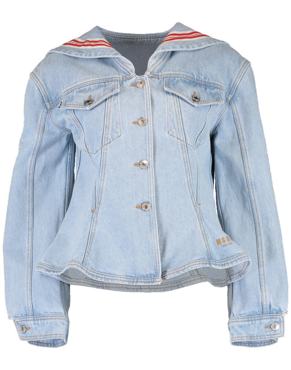 The Sailor denim jacket by MSGM features long sleeves, a V-neckline, button closure at front, 2 chest pockets, sailor cape with a red and white striped trim and silver-tone hardware throughout.
