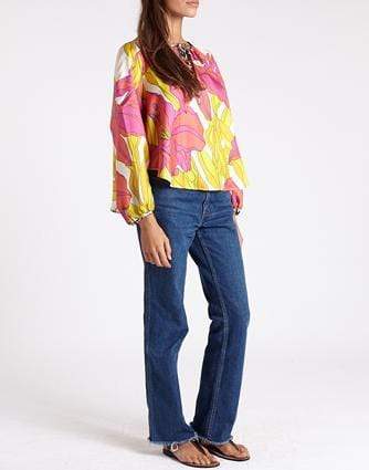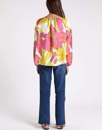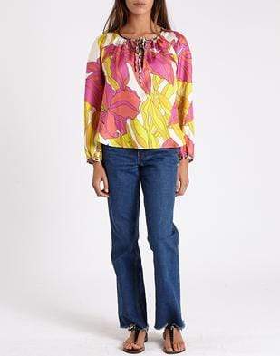 La Prestic Ouiston Saint Martin Lyx Chich Peasont Blouse in a bright, elegant print with panthère detail on the neck ties and wrists. This top features a V-neck and long full sleeves cinched at the wrist.