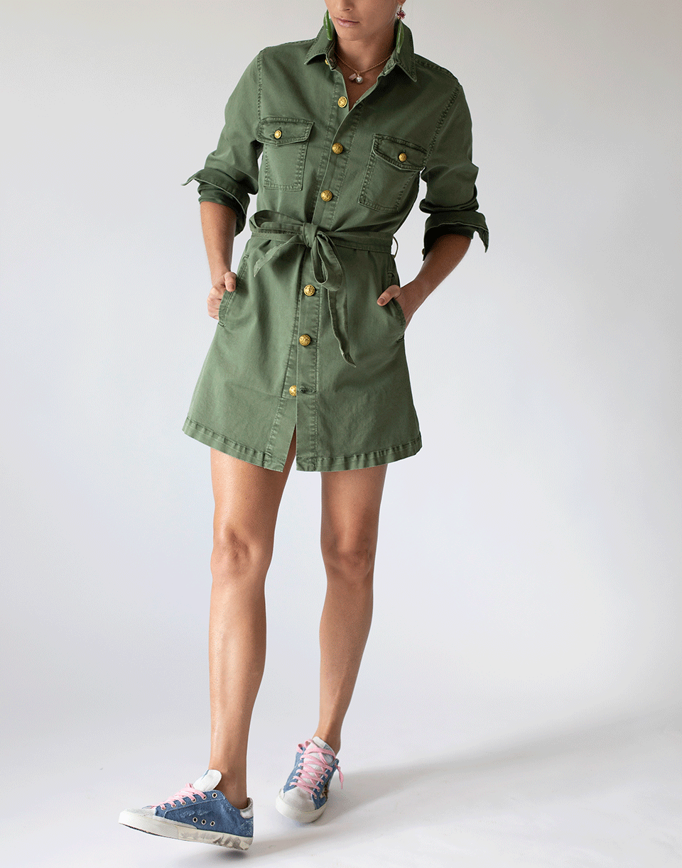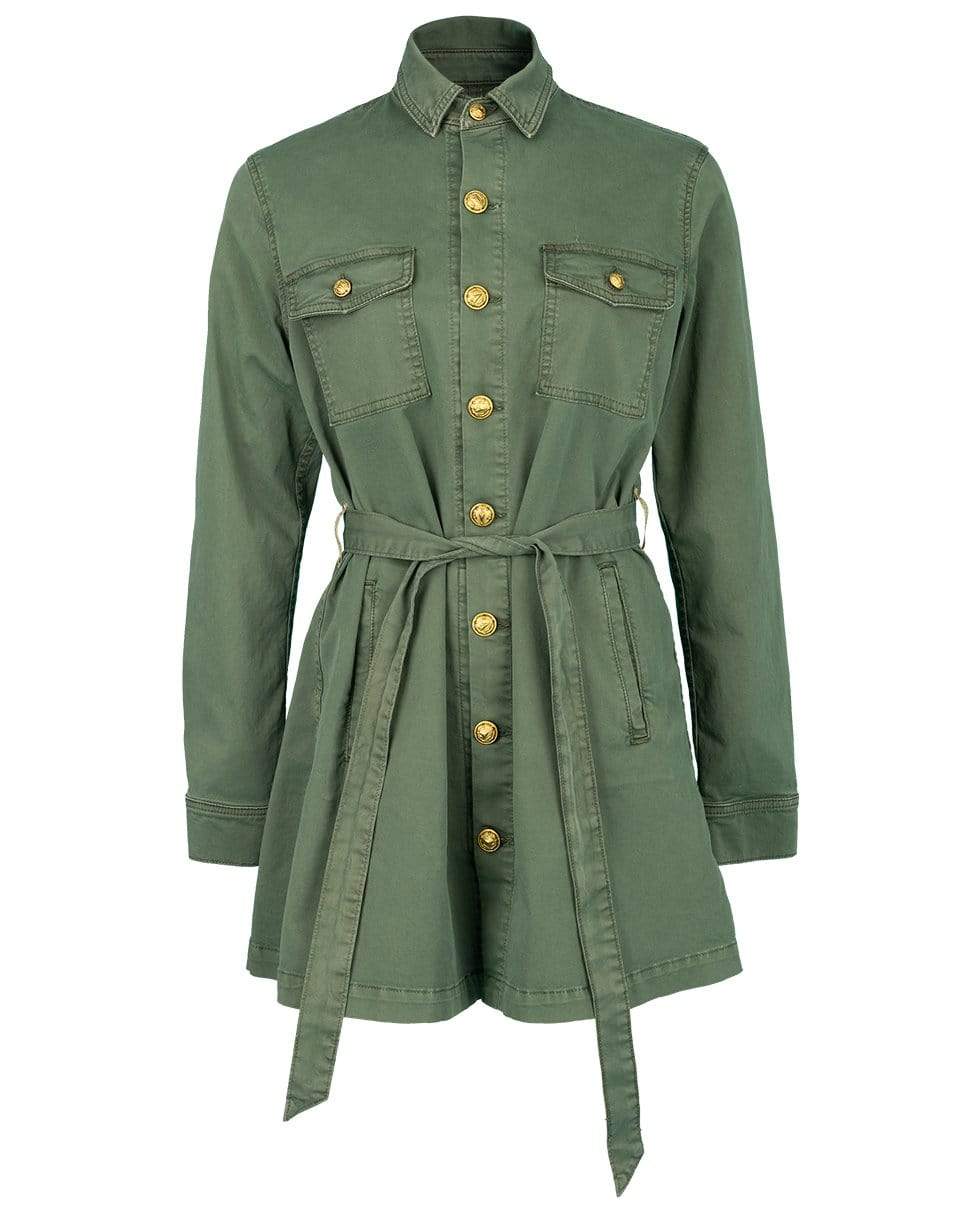 L'Agence denim Samantha Safari jacket with a slim fit, collar neckline, button front, long sleeves, front pockets, and a thigh length.