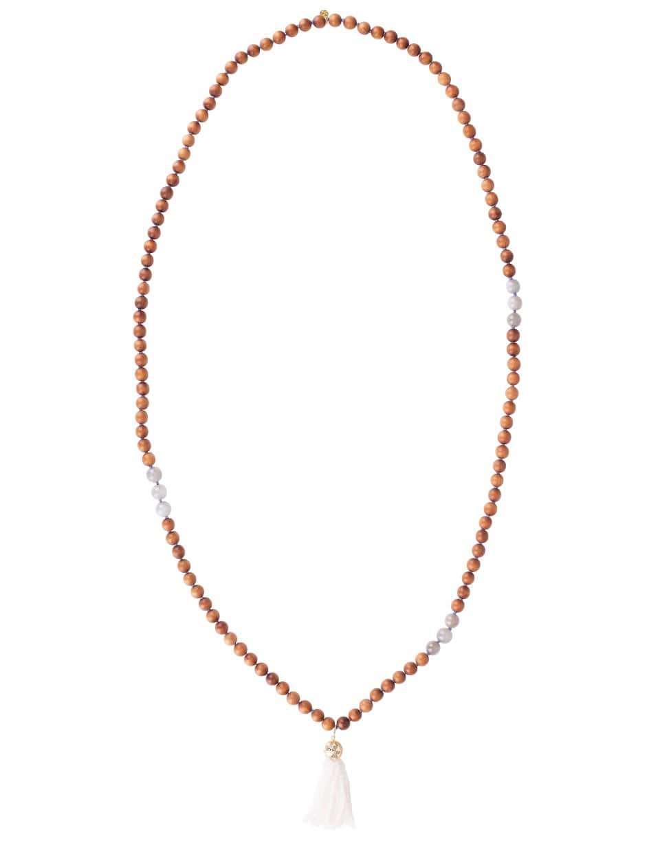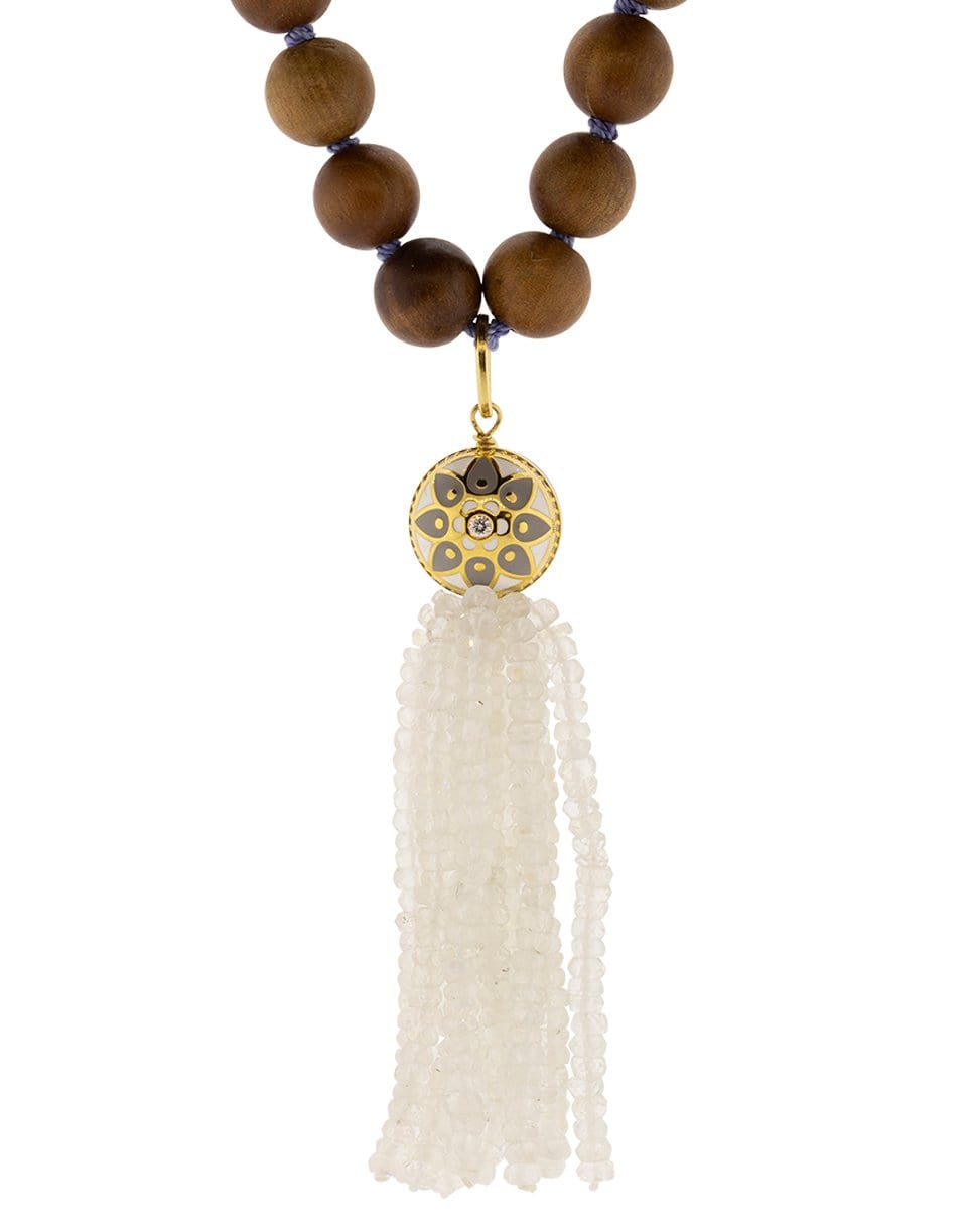 Sandalwood, moonstone, and enamel beaded tassel necklace from Buddha Mama.