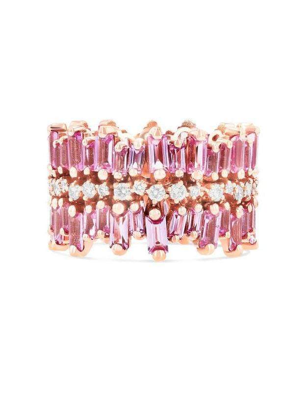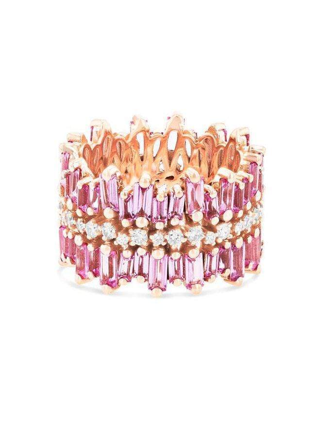 Suzanne Kalan sansa pink sapphire eternity band. Our trademark technique of using a mixture of baguette and round stones is conceptualized in a fresh new way with the Sansa design. Bright colored pink sapphires baguettes hug a row of brilliant round white diamonds to create a piece fit for royalty. This ring is sure to be the topic of conversation at any outing.