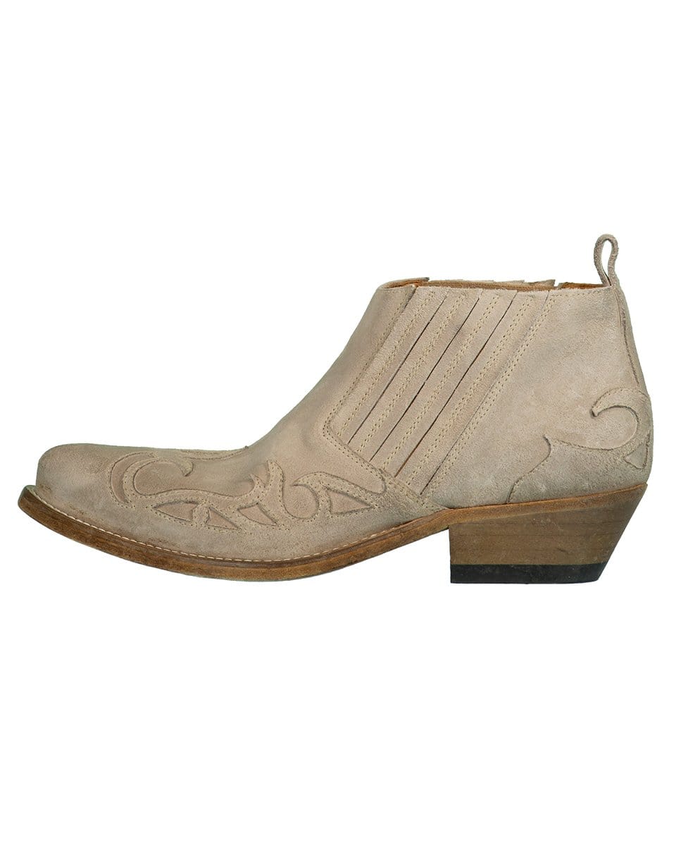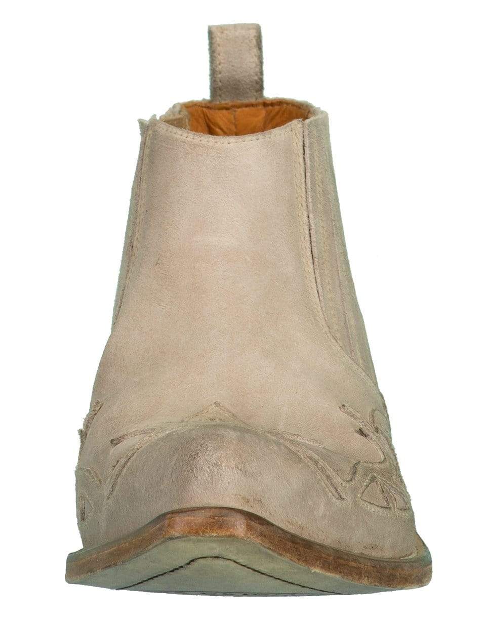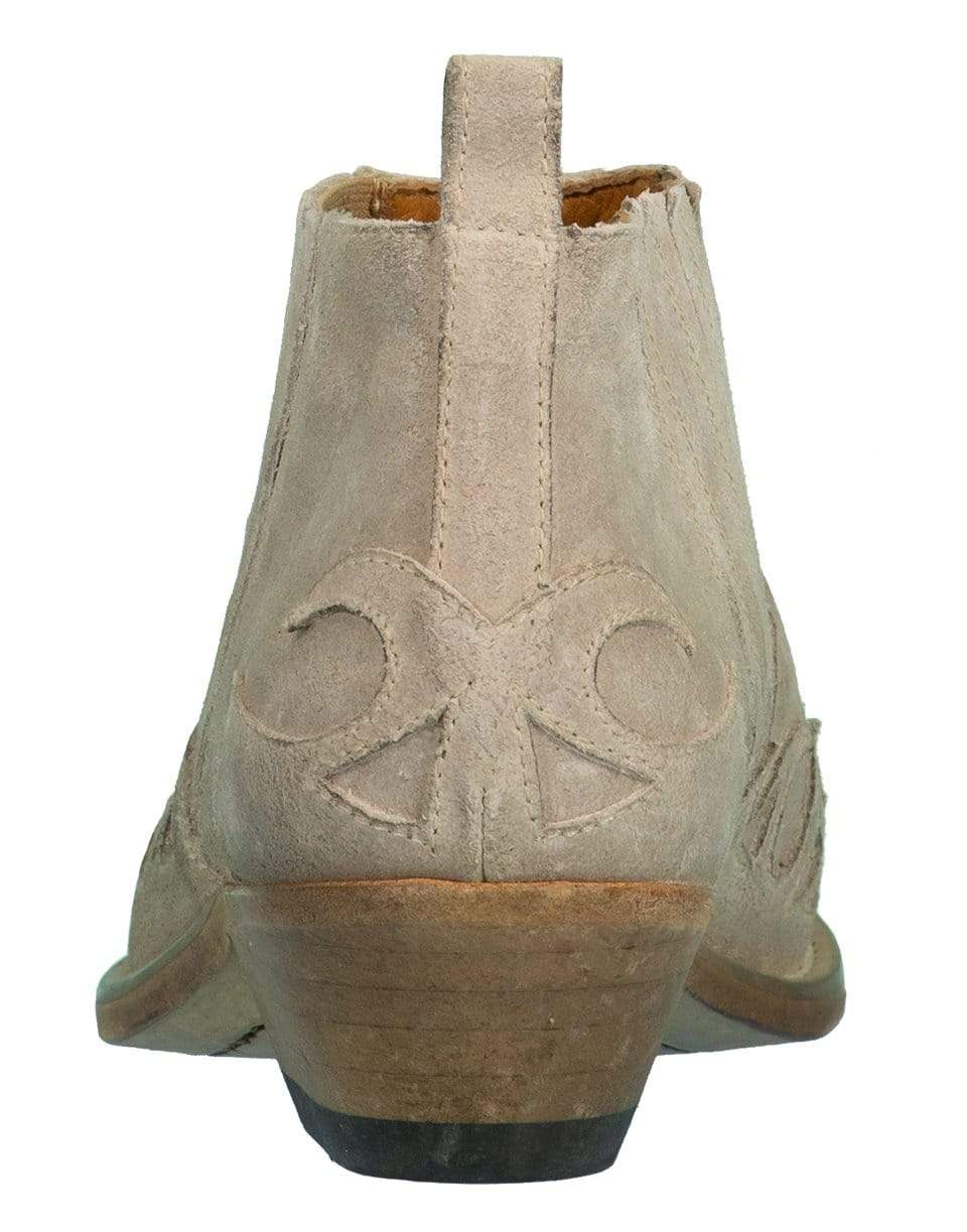 Italian handmade Golden Goose Santiago low leather boots crafted from limestone suede with a pointed toe, slip on style, and a pull tab at back.
