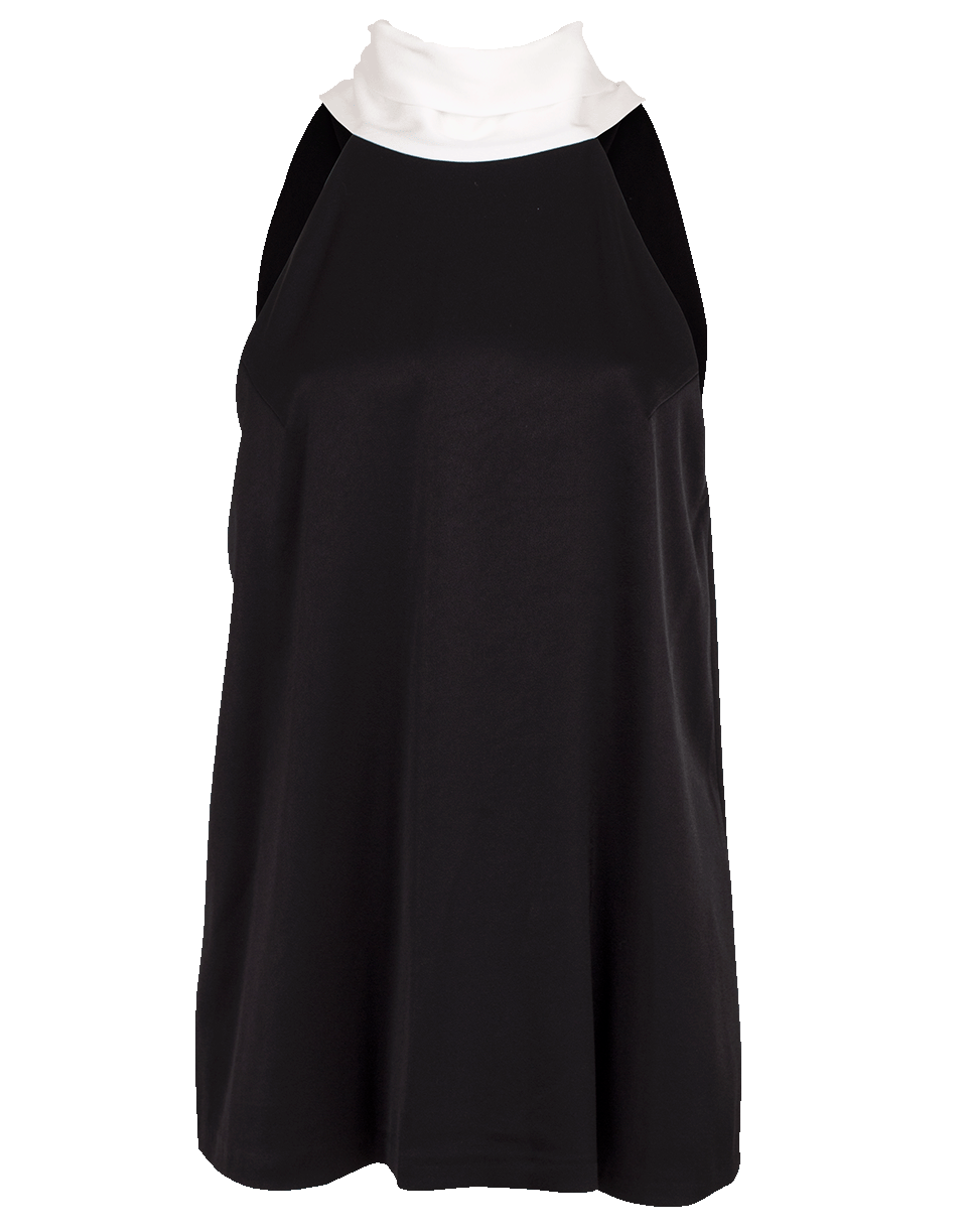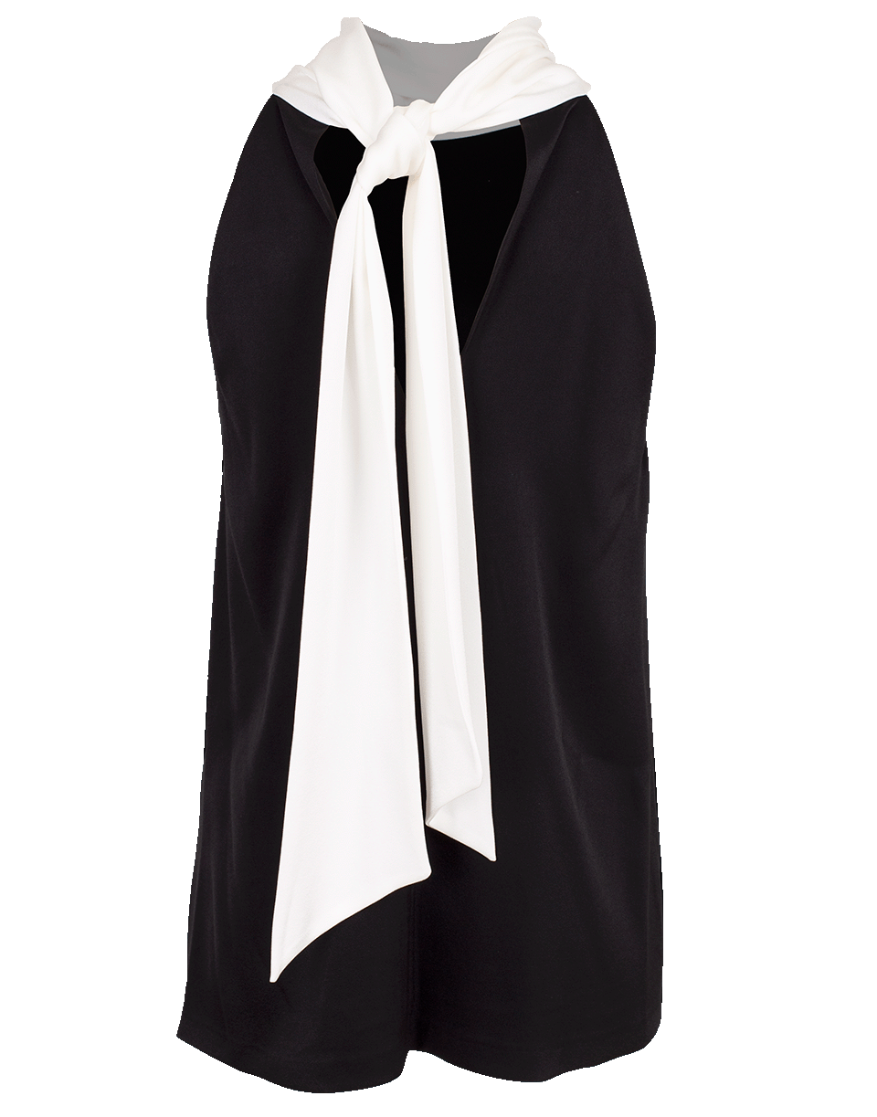 Black and white satin crepe sash neck tunic from Galvan London featuring a loose fit, tunic style, high neck, sleeveless cut, and a v-back with a long sash.