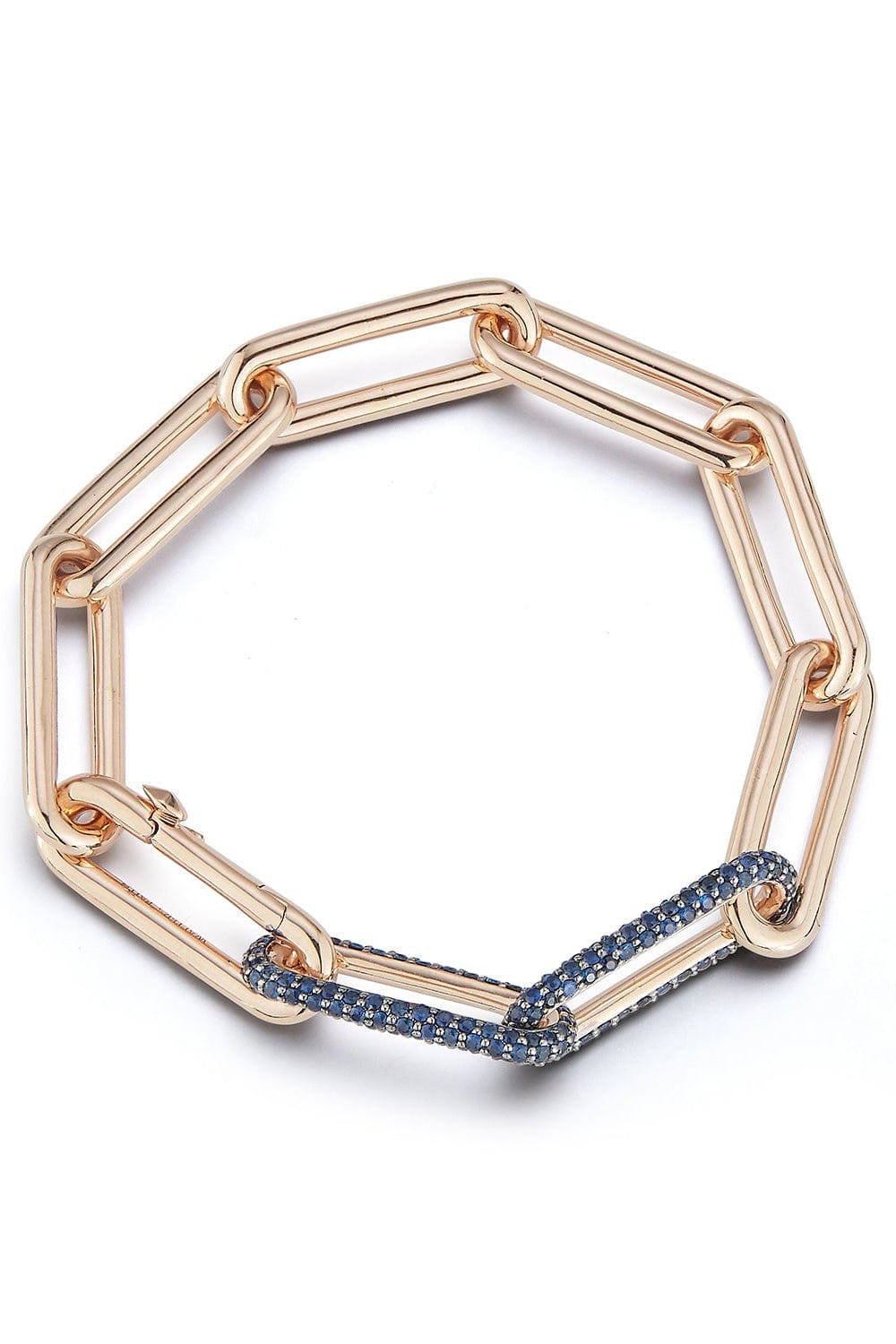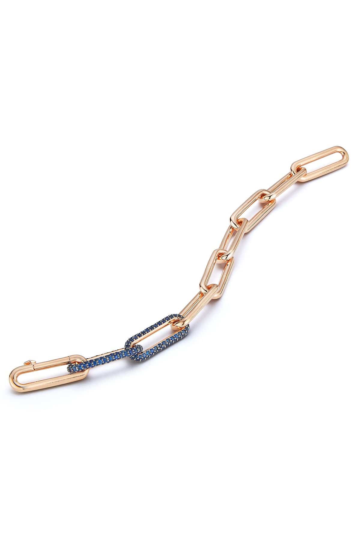 Walters Faith Saxon 18k rose gold elongated chain link bracelet with two blue sapphire and black rhodium links. Links are solid, not hollow.