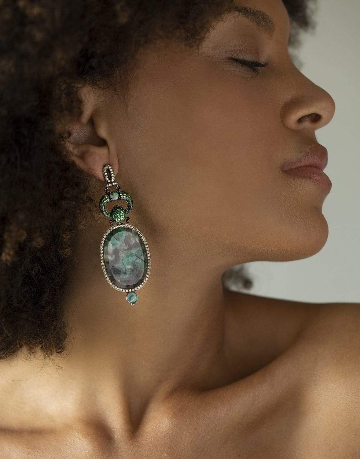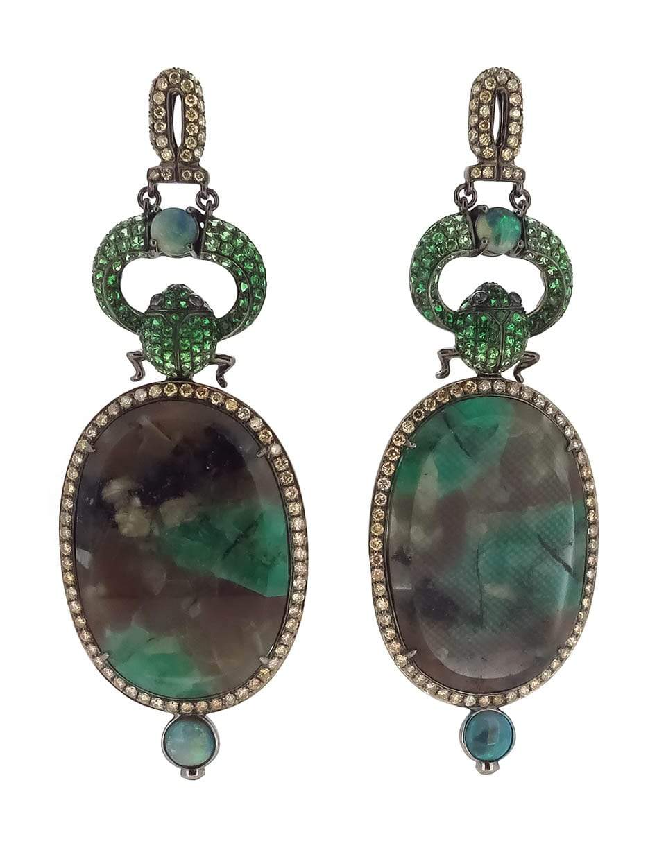 Wendy Yue Scarab Earrings. Tsvarite accented Scarab grasping an Opal is carrying an incredible sliced Emerald that truly comes to life in the light.