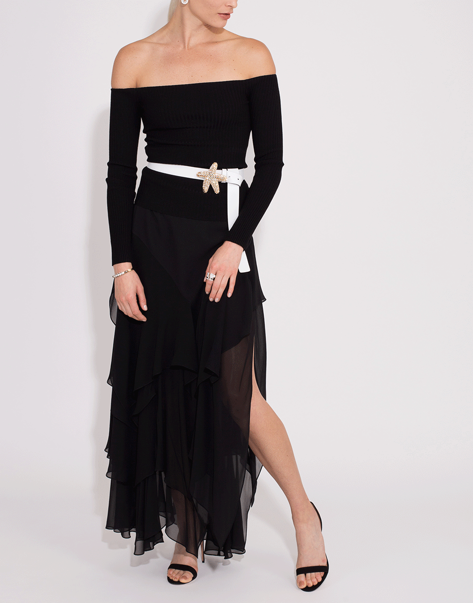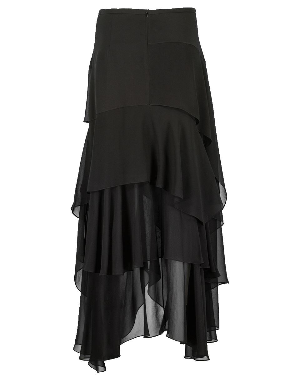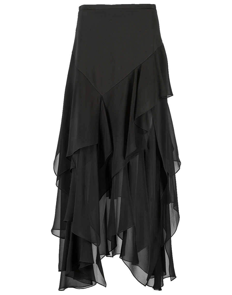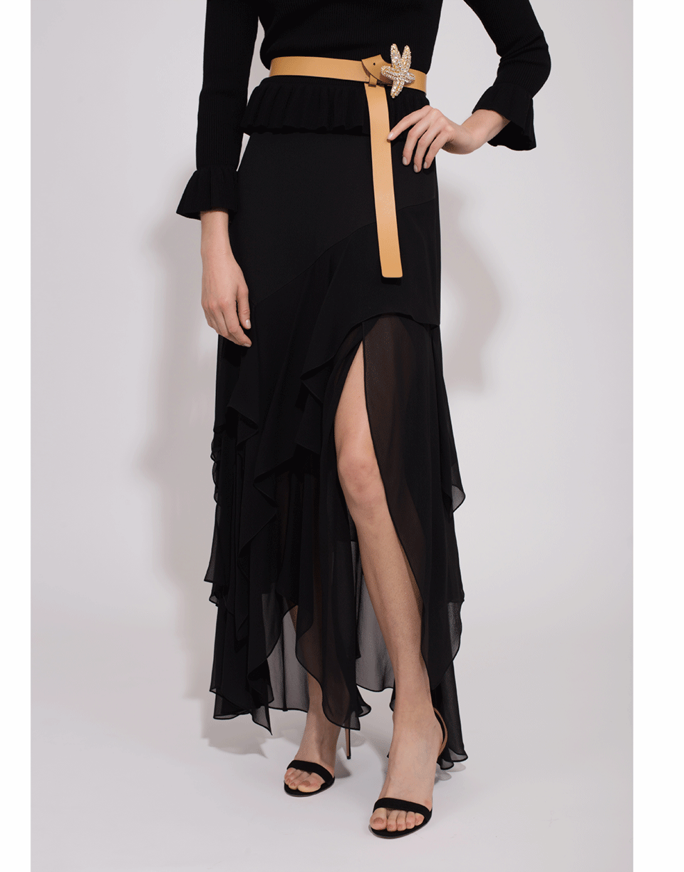 This flowy floor grazing scarf skirt is the perfect choice for summer dressing. It features cascading ruffles, a thigh-high slit and zip fastening.
