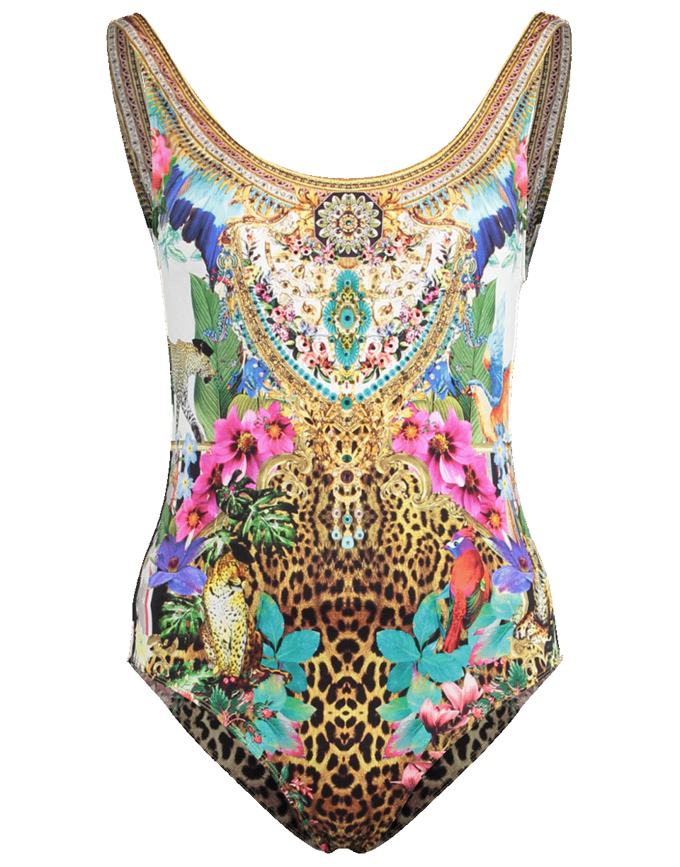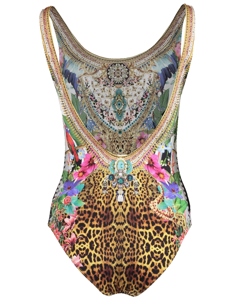Printed one-piece suit by Camilla. This Italian Lycra multicolored print swimsuit features a full-coverage fit best suited for bust cups A-C. It has a low scoop neck and back, leopard print lining, shoulder straps, removable padded cups and crystal details along the neckline.