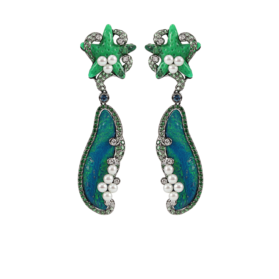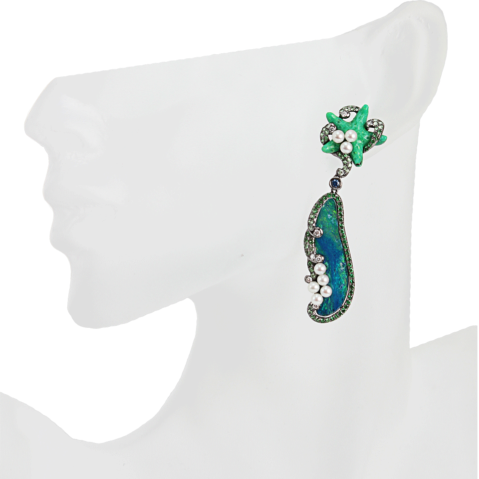 Let the imagination of men run wild and lure them in with your siren's call wearing these Wendy Yue sea-life opal drop earrings. Reminiscent of the briny deep and all that inhabits it, these earrings are fit for Triton's daughter but were made for you.