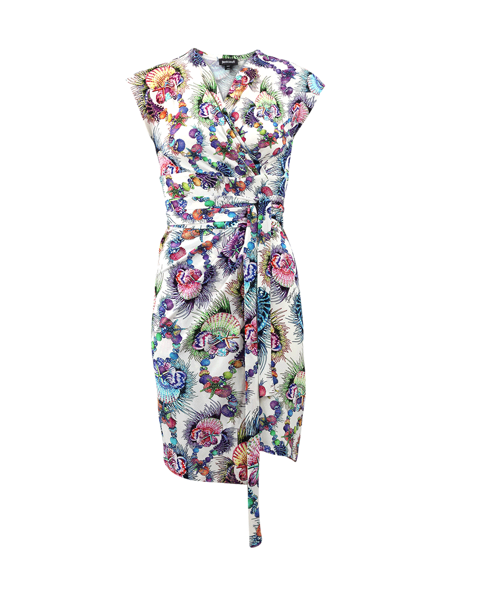 V-Cross Over Pleated Neckline, Side Zip Closure, Cap Sleeves, Wrap And Tie Belt