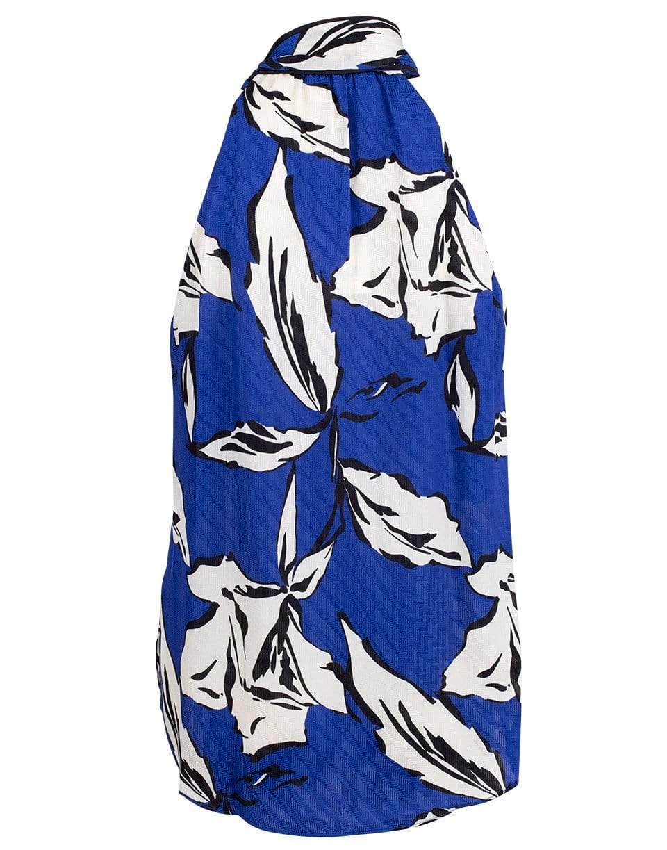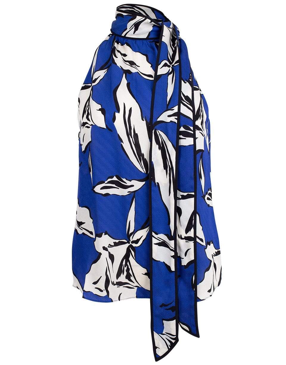 The Sela Top from Veronica Beard features a regular fit with a sleeveless cut, high neck, and a neck tie.