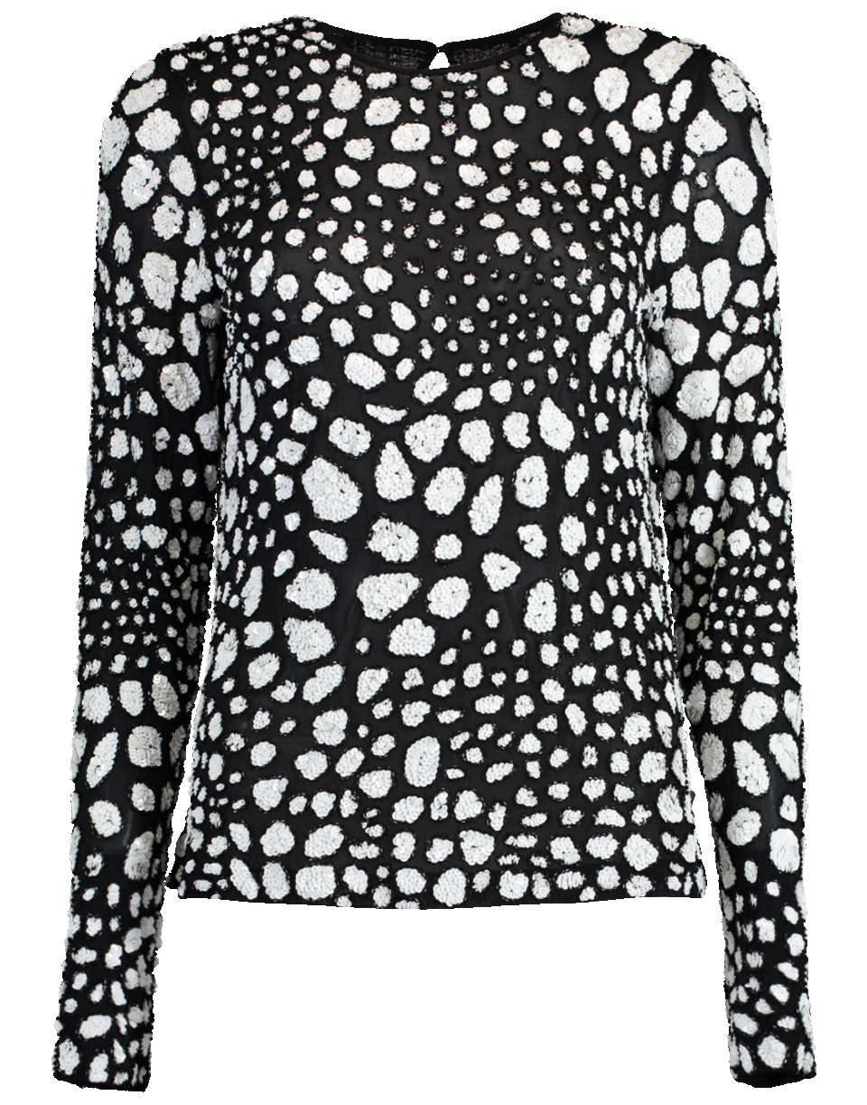 Black and white sequin top from Naeem Khan featuring long sleeves, round neck, keyhole detail, dot print with sequin embroidery, and a regular fit.