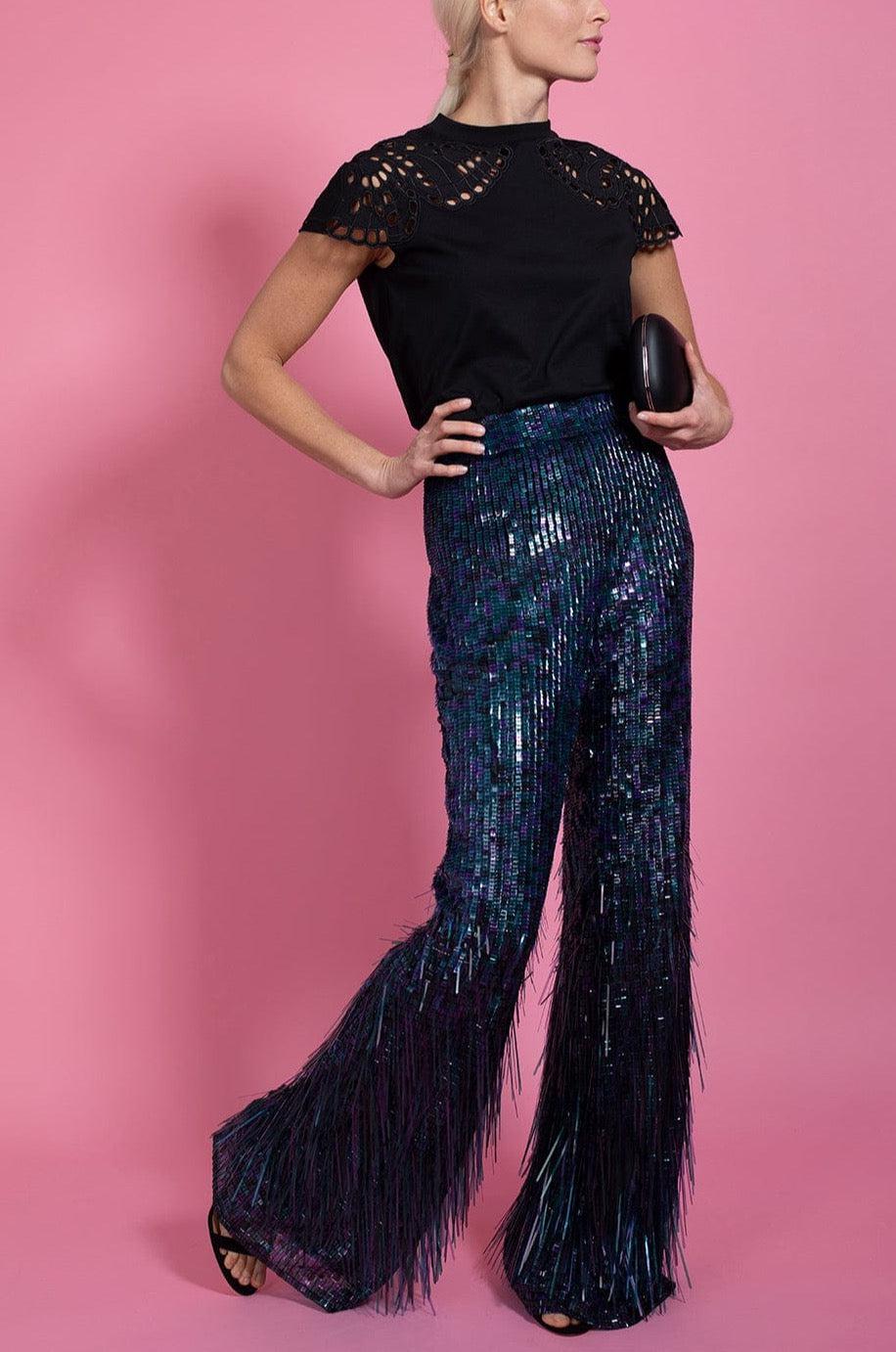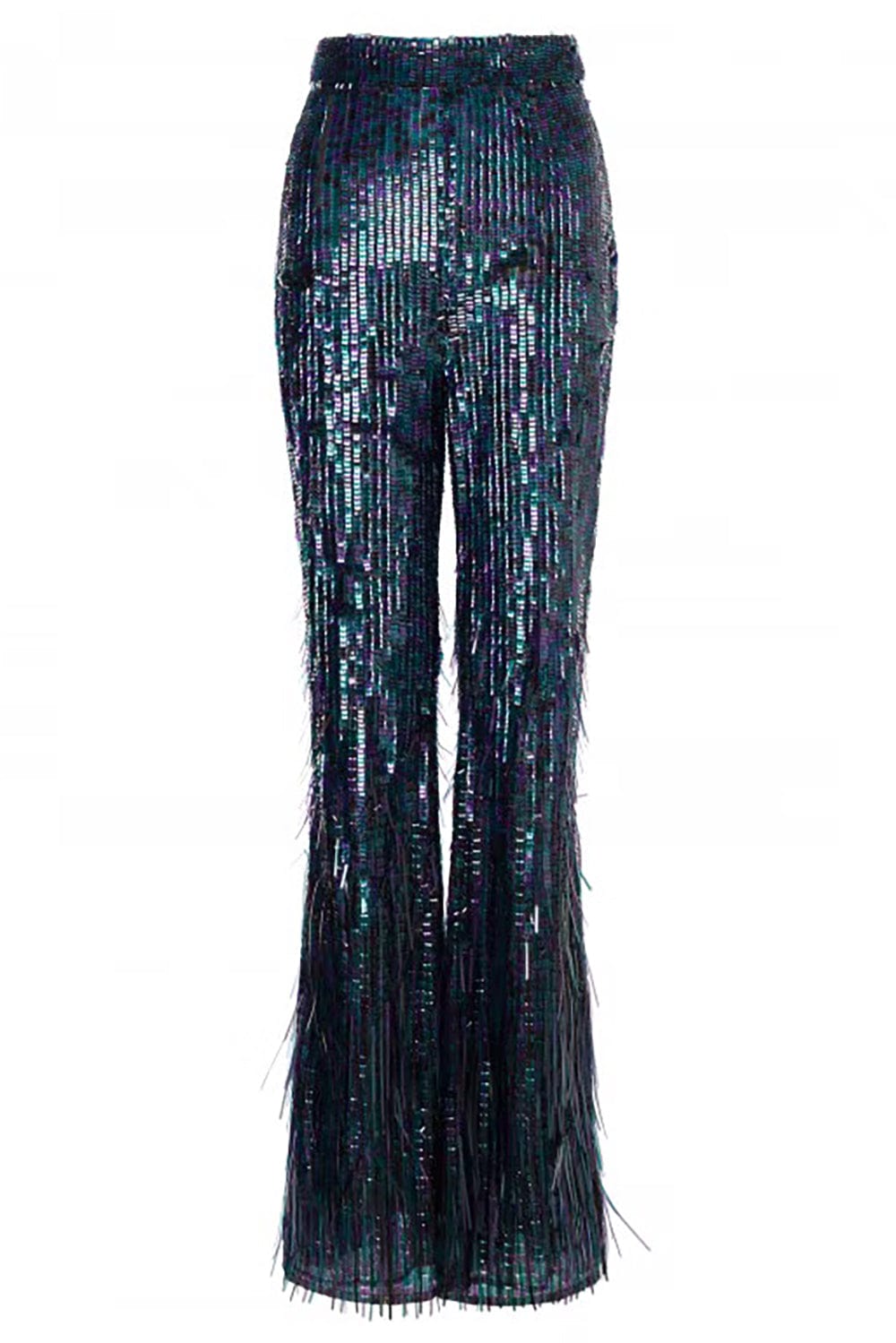 Alberta Ferretti sequin fringe side zip pants in fantasy print black.