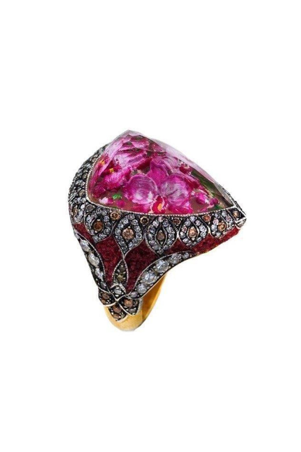 Sevan Bicakci carved carnelian floral bouquet ring in yellow gold.
