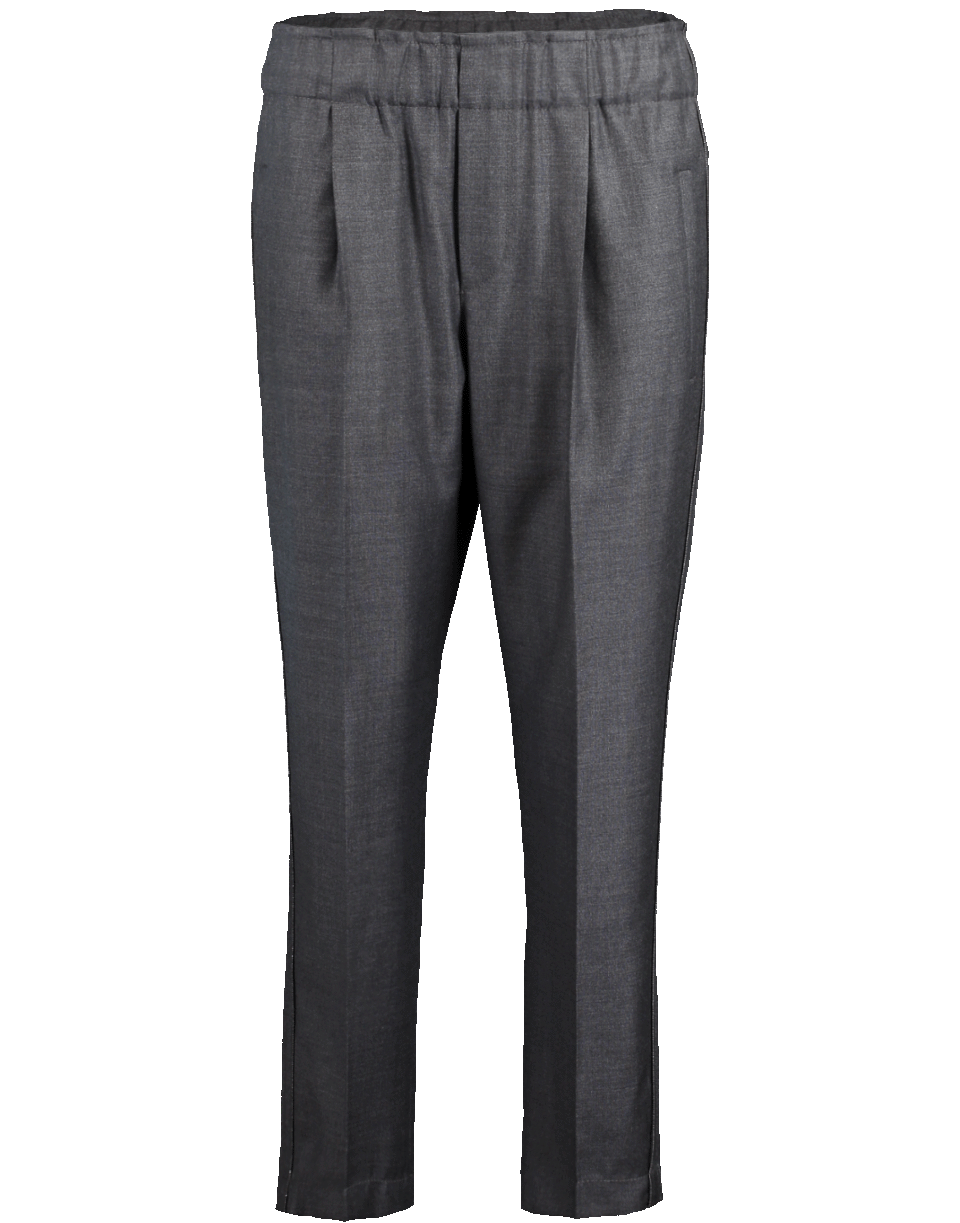 Sharkskin pull on tux pants by Brunello Cucinelli. Crafted from wool, these gray pants feature a tapered silhouette with delicate pleats and a gathered elastic waistline, back welt pockets, side slash pockets, mid-rise, straight legs, cropped above ankles, pull-on style and a relaxed fit.