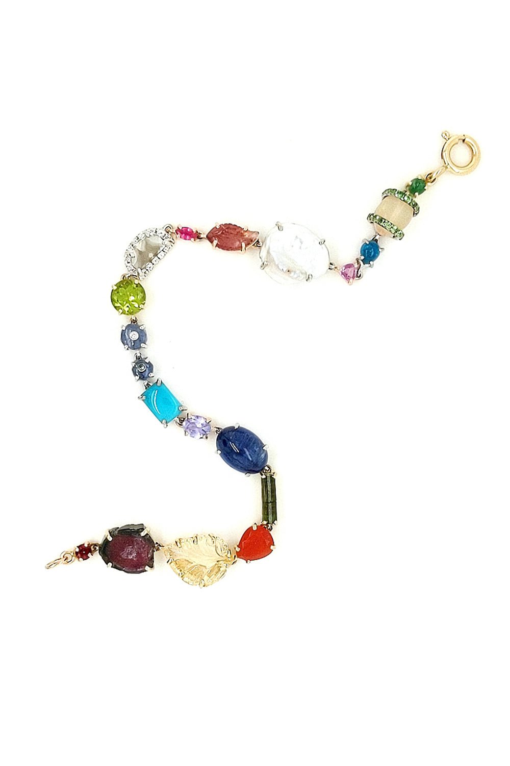 grey diamond, white diamond, emerald, opal apatite, pink sapphire, pearl, pink tourmaline, ruby, peridot, blue sapphire, turquoise - (sleeping beauty mine) spinel kyanite, green tourmaline, fire opal, citrine, watermelon tourmaline, anthill garnet, tsavorite